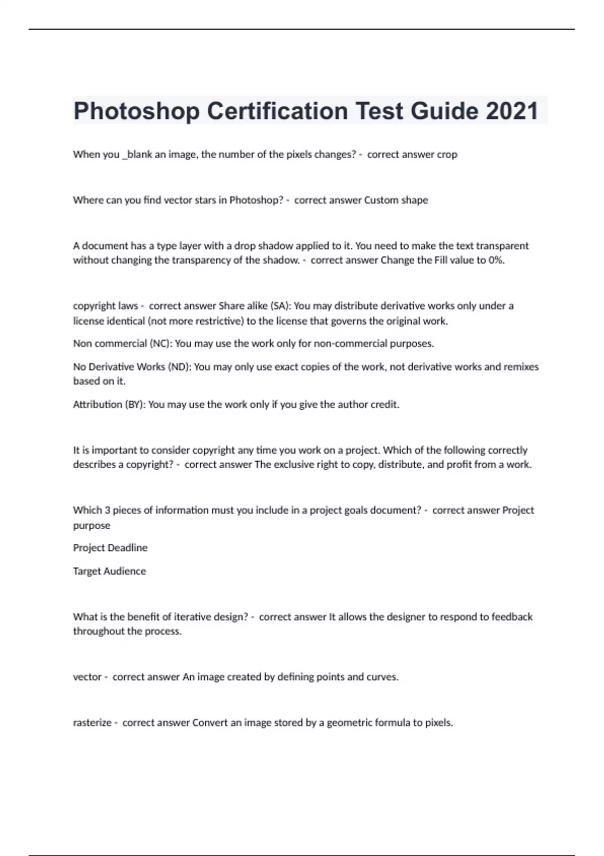 Photoshop Certification Test Guide 2021When you _blank an image, the number of the pixels changes? - correct answer crop Where can you find vector stars in Photoshop? - correct answer Custom shape A document has a type layer with a drop shadow applied to it. You need to make the text transparent without changing the transparency of the shadow. - correct answer Change the Fill value to 0%. copyright laws - correct answer Share alike (SA): You may distribute derivative works only under a license identical (not more restrictive) to the license that governs the original work. Non commercial (NC): You may use the work only for non-commercial purposes. No Derivative Works (ND): You may only use exact copies of the work, not derivative works and remixes based on it. Attribution (BY): You may use the work only if you give the author credit. It is important to consider copyright any time you work on a project. Which of the following correctly describes a copyright? - correct answer The exclusive right to copy, distribute, and profit from a work. Which 3 pieces of information must you include in a project goals document? - correct answer Project purpose Project Deadline Target Audience What is the benefit of iterative design? - correct answer It allows the designer to respond to feedback throughout the process. vector - correct answer An image created by defining points and curves. rasterize - correct answer Convert an image stored by a geometric formula to pixels.