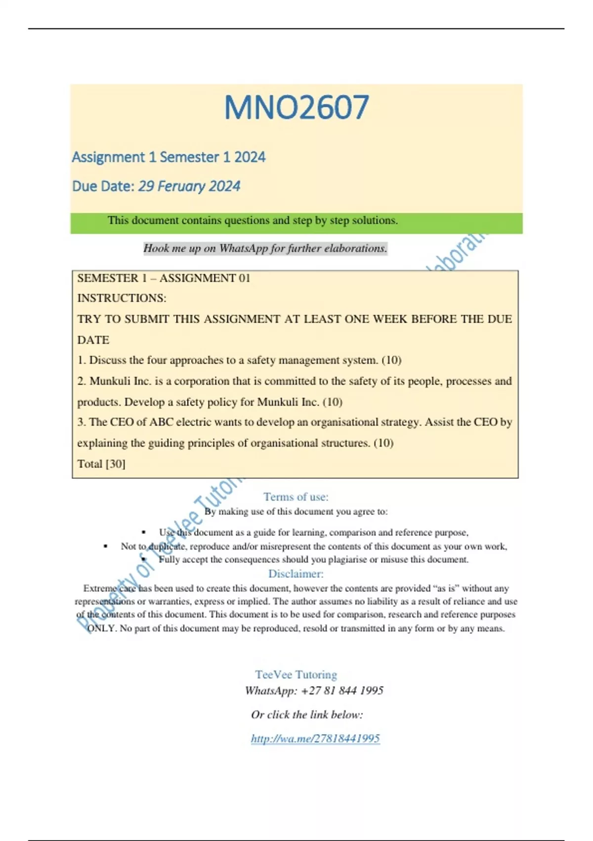 SEMESTER 1 – ASSIGNMENT 01 INSTRUCTIONS: TRY TO SUBMIT THIS ASSIGNMENT AT LEAST ONE WEEK BEFORE THE DUE DATE 1. Discuss the four approaches to a safety management system. (10) 2. Munkuli Inc. is a corporation that is committed to the safety of its people, processes and products. Develop a safety policy for Munkuli Inc. (10) 3. The CEO of ABC electric wants to develop an organisational strategy. Assist the CEO by explaining the guiding principles of organisational structures. (10) Total [30]