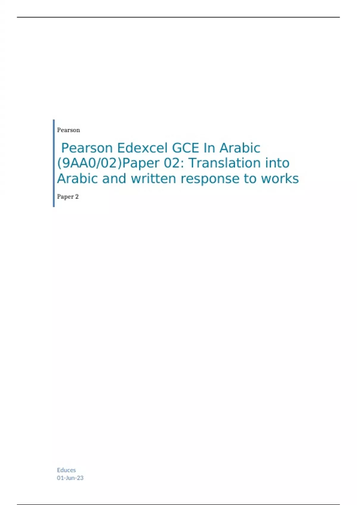 Edexcel GCE In Arabic (9AA0/02)Paper 02: Translation into Arabic and written response to works
