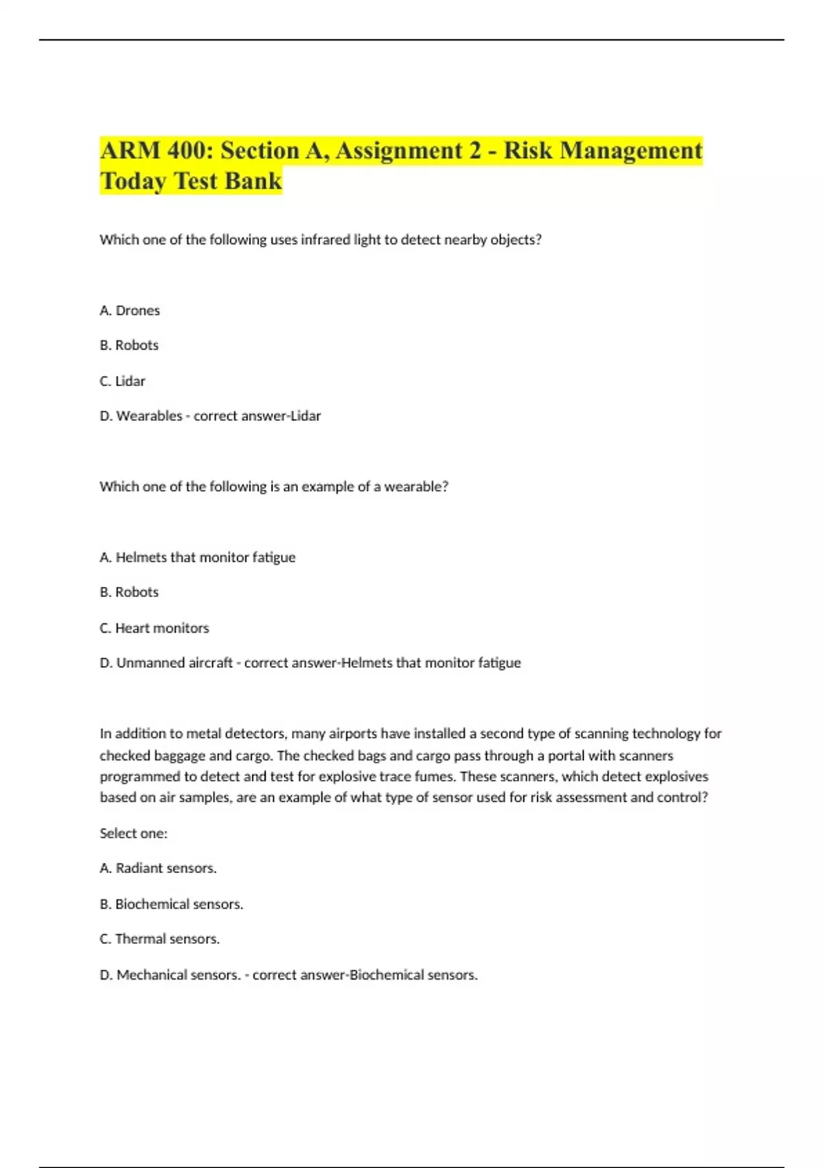 ARM 400: Section A, Assignment 2 - Risk Management Today Test Bank