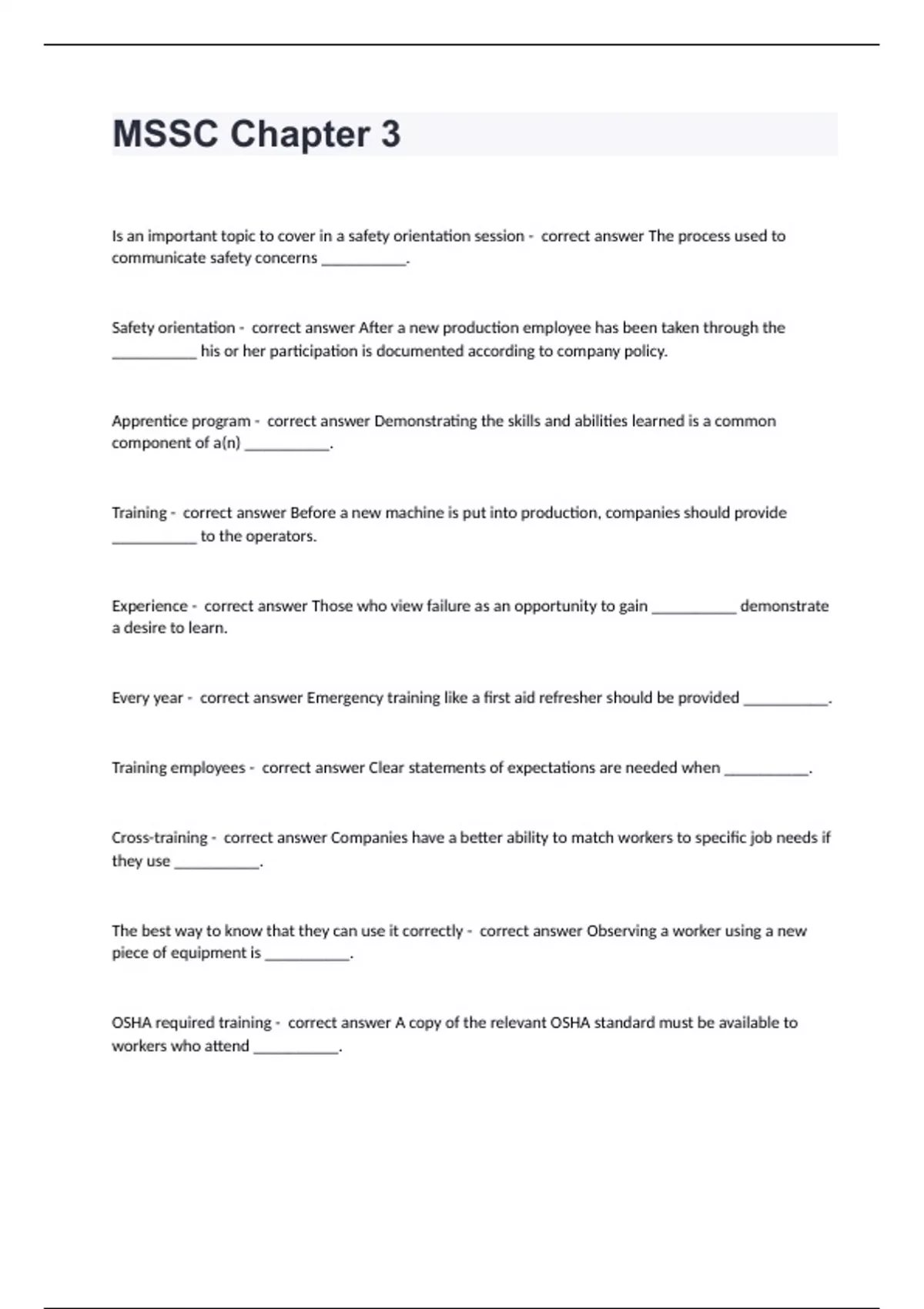 MSSC Chapter 3Is an important topic to cover in a safety orientation session - correct answer The process used to communicate safety concerns __________. Safety orientation - correct answer After a new production employee has been taken through the __________ his or her participation is documented according to company policy. Apprentice program - correct answer Demonstrating the skills and abilities learned is a common component of a(n) __________. Training - correct answer Before a new machine is put into production, companies should provide __________ to the operators. Experience - correct answer Those who view failure as an opportunity to gain __________ demonstrate a desire to learn. Every year - correct answer Emergency training like a first aid refresher should be provided __________. Training employees - correct answer Clear statements of expectations are needed when __________. Cross-training - correct answer Companies have a better ability to match workers to specific job needs if they use __________. The best way to know that they can use it correctly - correct answer Observing a worker using a new piece of equipment is __________. OSHA required training - correct answer A copy of the relevant OSHA standard must be available to workers who attend __________.
