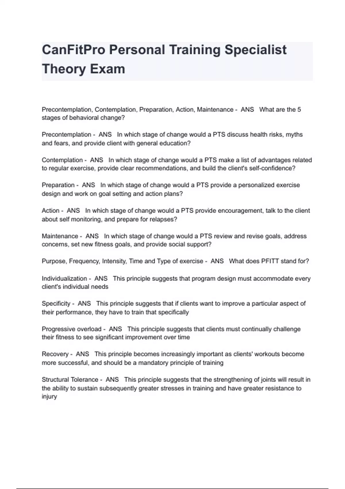CanFitPro Personal Training Specialist Theory Exam Questions And Answers Precontemplation, Contemplation, Preparation, Action, Maintenance - ANS What are the 5 stages of behavioral change? Precontemplation - ANS In which stage of change would a PTS discuss health risks, myths and fears, and provide client with general education? Contemplation - ANS In which stage of change would a PTS make a list of advantages related to regular exercise, provide clear recommendations, and build the client's self-confidence? Preparation - ANS In which stage of change would a PTS provide a personalized exercise design and work on goal setting and action plans? Action - ANS In which stage of change would a PTS provide encouragement, talk to the client about self monitoring, and prepare for relapses? Maintenance - ANS In which stage of change would a PTS review and revise goals, address concerns, set new fitness goals, and provide social support? Purpose, Frequency, Intensity, Time and Type of exercise - ANS What does PFITT stand for? Individualization - ANS This principle suggests that program design must accommodate every client's individual needs Specificity - ANS This principle suggests that if clients want to improve a particular aspect of their performance, they have to train that specifically Progressive overload - ANS This principle suggests that clients must continually challenge their fitness to see significant improvement over time Recovery - ANS This principle becomes increasingly important as clients' workouts become more successful, and should be a mandatory principle of training Structural Tolerance - ANS This princip