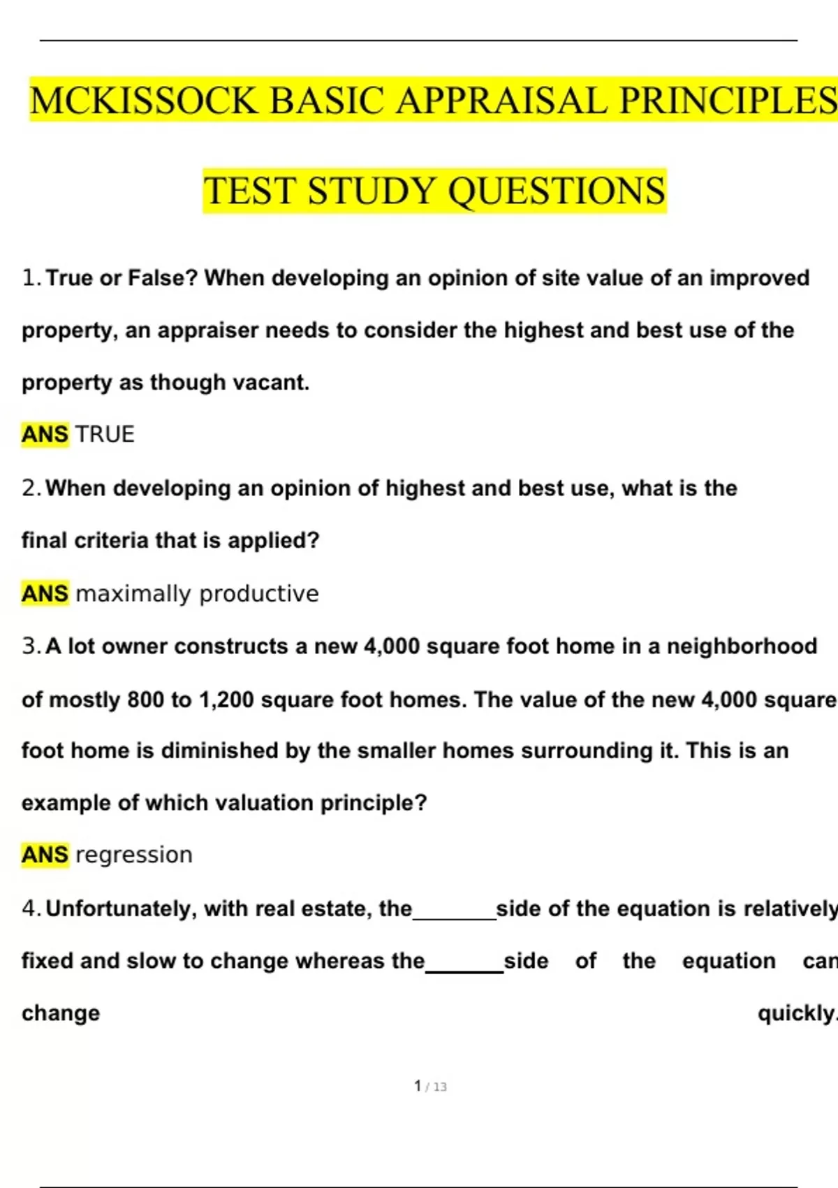 MCKISSOCK BASIC APPRAISAL PRINCIPLES TEST STUDY Questions and Answers (2024 / 2025) (Verified Answers)