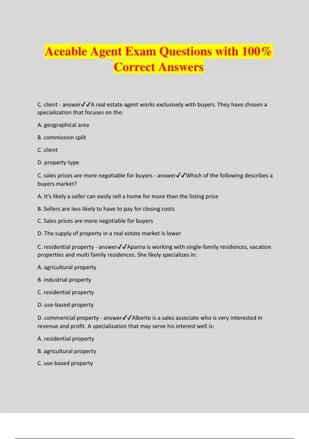Aceable Agent Exam Questions with 100% Correct Answers C. client - answerA real estate agent works exclusively with buyers. They have chosen a specialization that focuses on the: A. geographical area B. commission split C. client D. property type C. sales prices are more negotiable for buyers - answerWhich of the following describes a buyers market? A. It's likely a seller can easily sell a home for more than the listing price B. Sellers are less likely to have to pay for closing costs C. Sales prices are more negotiable for buyers D. The supply of property in a real estate market is lower C. residential property - answerAparna is working with single-family residences, vacation properties and multi family residences. She likely specializes in: A. agricultural property B. industrial property C. residential property D. use-based property D. commericial property - answerAlberto is a sales associate who is very interested in revenue and profit. A specialization that may serve his interest well is: A. residential property B. agricultural property C. use-based property D. commercial property C. ethics - answerWhat dictates what is considered acceptable at a higher level? A. individual opinions B. industry standards C. ethics D. laws C. the recording of property conveyance - answerFlorida has many miles of coastal property. The state helps regulate and protect this coastal property, along with taking a large part of the responsibility of regulating: A. the IRS B. zoning C. the recording of property conveyance D. veterans affairs B. Karen, an applicant who was honorably discharged from active military duty four months ago. - answerWhich of these applicants will have their application fee waived? A. George, an applicant whose spouse once served on active military duty, more than 60 months ago B. Karen, an applicant who was honorably discharged from active military duty four months ago C. Aaron, who qualifies as a low-income applicant D. Randall, a member of the Florida Bar Association B. She should order a copy of her criminal record to ensure the misdemeanor has been expunged. - answerKim is applying for her sales associate license. She pled guilty to a misdemeanor in her youth, paid a fine, spent some time on probation, and has since lived life on the straight and narrow. She thinks that misdemeanor has been expunged from her record, but she's not completely sure. What is her BEST course of action? A. She should submit her application and if it turns up, she can explain it to FREC then B. She should order a copy of her criminal record to ensure the misdemeanor has been expunged C. She should hire a lawyer to do a full scrub of her past D. She should not apply for a license since she has a criminal record C. 21 - answerAletheia applied for a sales associate license and was rejected. How many days does she have to request a formal hearing? A. 90 B. 46 C. 21 D. 30 C. Jose said he could fly, then took off into the air - answerWhich of these scenarios is an example of prima facie evidence? A. Jeremiah said he could teleport, then told you to meet him in an hour across town B. Jenny said she was impervious to bullets, then showed you a picture of a bullet C. Jose said he could fly, then took off into the air D. Jeremy said he had an invisibility cloak, but it was at his grandma's house right now so he couldn't show it to you B. No, he is licensed but not registered, because his status is not yet active - answerLorenzo is working toward his sales associate license. He has completed his pre-licensing education, submitted his fingerprints, submitted an application, had the application accepted, taken the state exam, and passed. At the testing center, he was given a license number and a photo- bearing proof of licensure. He asked his sponsoring broker to fill out the paperwork for his employment. Today, he checked the DBPR website and his status is "inactive." Is he registered? Why or why not? A. Yes, because he has found a sponsoring broker, he is registered B. No, he is licensed but not registered, because his status is not yet active C. No, he is not registered, because he is licensed D. Yes, he is licensed and registered because he appears on the DBPR website D. Maria is a licensed sales associate living in Alabama - answerWhich of these people is eligible for mutual recognition in Florida? A. Manuel has a Connecticut broker license, and has been staying with his mother in Florida for six months B. Marcus is a licensed sales associate living in New York C. Melissa is a member of the Florida Bar living in Florida D. Maria is a licensed sales associate living in Alabama B. a 45-hour post-licensing education course - answerA sales associate's first renewal is coming up in six months. What must they complete before that date, if they want to retain their license? A. 14 hours of continued education B. a 45-hour post-licensing education course C. a 30-hour post-licensing education course, plus 14 house of continued education D. A 60-hour post licensing education course D. Cory, a sales associate with a four-year degree in real estate from an accredited university - answerWhich of these people will need to complete 14 hours of CE before their next renewal? A. Cayley, a sales associate renewing for the first time B. Cambria, a member of the Florida Bar Association and sales associate C. Camilla, a broker renewing for the first time D. Cory, a sales associate with a four-year degree in real estate from an accredited university B. absentee owner - answerMiguel owns a beautiful property in Fort Lauderdale. As beautiful as it is, he doesn't live there. Miguel is a(n): A. negligent owner B. absentee owner C. tax-exempt owner D. from-afar owner C. They typically require niche knowledge - answerWhat might be challenging about managing a special-purpose property such as a sports arena or movie theatre? A. There is no way to predict the behavior of special purpose properties B. They are usually owner-occupied C. They