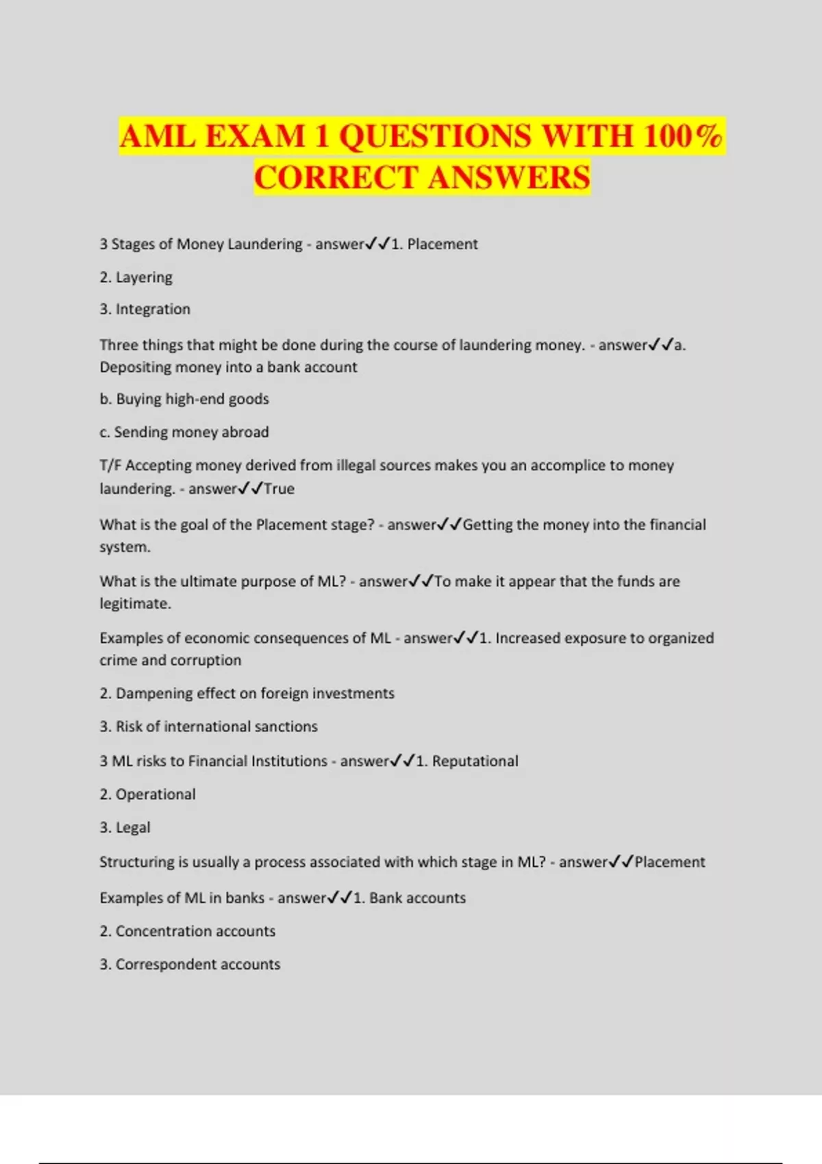 AML EXAM 1 QUESTIONS WITH 100% CORRECT ANSWERS 3 Stages of Money Laundering - answer1. Placement 2. Layering 3. Integration Three things that might be done during the course of laundering money. - answera. Depositing money into a bank account b. Buying high-end goods c. Sending money abroad T/F Accepting money derived from illegal sources makes you an accomplice to money laundering. - answerTrue What is the goal of the Placement stage? - answerGetting the money into the financial system. What is the ultimate purpose of ML? - answerTo make it appear that the funds are legitimate. Examples of economic consequences of ML - answer1. Increased exposure to organized crime and corruption 2. Dampening effect on foreign investments 3. Risk of international sanctions 3 ML risks to Financial Institutions - answer1. Reputational 2. Operational 3. Legal Structuring is usually a process associated with which stage in ML? - answerPlacement Examples of ML in banks - answer1. Bank accounts 2. Concentration accounts 3. Correspondent accounts 4. Electronic funds transfer 5. Payable through-accounts 6. Private banking Vulnerabilities of ML in Correspondent banking - answer- Correspondent banking relationships create a situation in which a financial institution carries out transactions on behalf of customers of another institution. - The amount of money that flows through correspondent accounts can pose a significant threat to financial institutions, as they process large volumes of transactions for their customers' customers. Examples of ML in non-bank financial institutions - answer1. Credit and Debit cards 2. Money remitters / Money exch