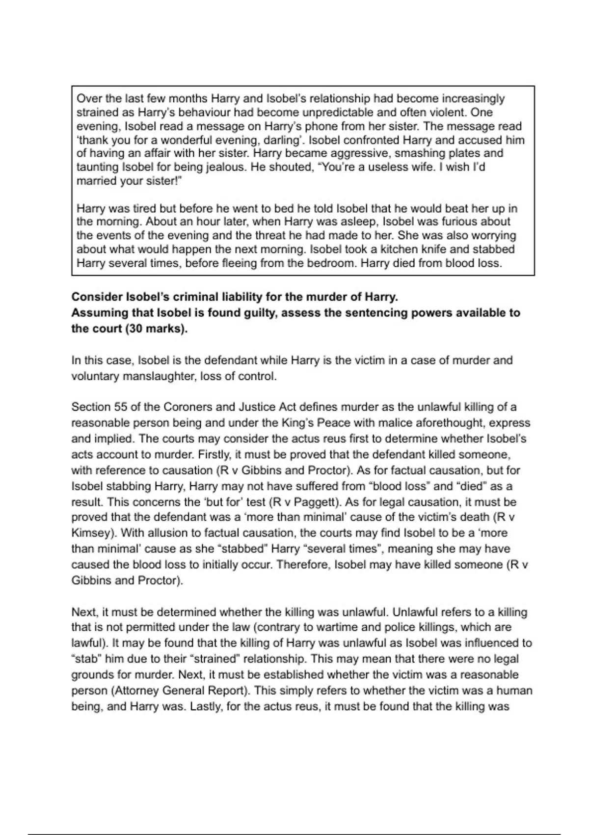 A-Level AQA Criminal Law Essay (Murder & Loss of Control) (28/30 - A*)