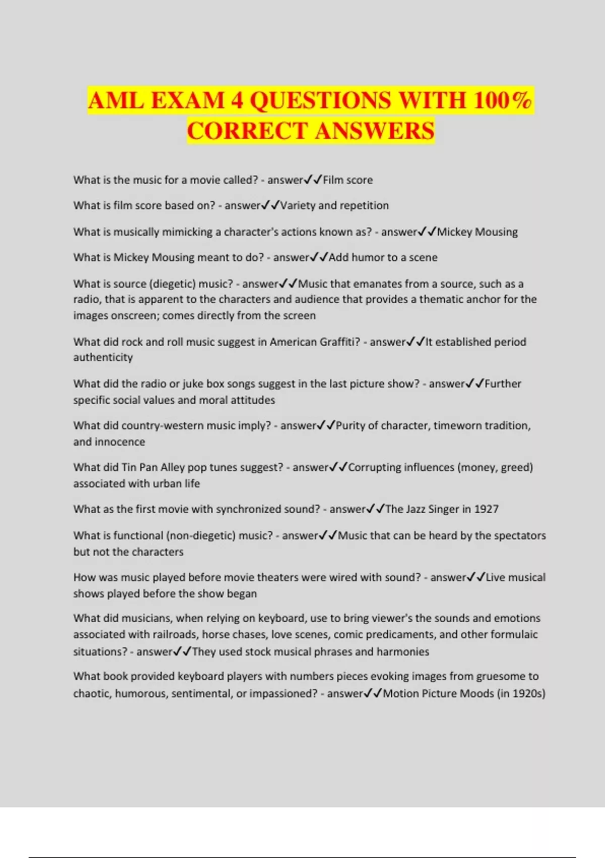 AML EXAM 4 QUESTIONS WITH 100% CORRECT ANSWERS What is the music for a movie called? - answerFilm score What is film score based on? - answerVariety and repetition What is musically mimicking a character's actions known as? - answerMickey Mousing What is Mickey Mousing meant to do? - answerAdd humor to a scene What is source (diegetic) music? - answerMusic that emanates from a source, such as a radio, that is apparent to the characters and audience that provides a thematic anchor for the images onscreen; comes directly from the screen What did rock and roll music suggest in American Graffiti? - answerIt established period authenticity What did the radio or juke box songs suggest in the last picture show? - answerFurther specific social values and moral attitudes What did country-western music imply? - answerPurity of character, timeworn tradition, and innocence What did Tin Pan Alley pop tunes suggest? - answerCorrupting influences (money, greed) associated with urban life What as the first movie with synchronized sound? - answerThe Jazz Singer in 1927 What is functional (non-diegetic) music? - answerMusic that can be heard by the spectators but not the characters How was music played before movie theaters were wired with sound? - answerLive musical shows played before the show began What did musicians, when relying on keyboard, use to bring viewer's the sounds and emotions associated with railroads, horse chases, love scenes, comic predicaments, and other formulaic situations? - answerThey used stock musical phrases and harmonies What book provided keyboard players with numbers pieces evoking images from gruesome to chaotic, humorous, sentimental, or impassioned? - answerMotion Picture Moods (in 1920s) How did music depict women, American Indians, and African Americans? - answerIt was unfavorable and stereotypical What is the difference between a soundtrack and a film score? - answerA sound track refers to the dialogue, sound effects, and the music while the film score only refers to the music When did recording technology make it possible to accompany dialogue with background music without dominating or drowning out the spoken words? - answerBy 1934 Most of the classical composers working in Hollywood were from where? - answerEurope Which American composer of concert music wrote films for several government-sponsored documentary films (The Plow That Broke the Plains)? - answerVirgil Thompson Which American film score composer was brought an Academy Award for "The Heiress"? - answerAaron Copland Which movie introduced Irving Berlin's "White Christmas"? - answerHoliday Inn What is the classical Hollywood film score? - answerLavishly varied sounds of orchestral instruments Which Hollywood triumvirate is best remembered for the music they created for films and applying highly romantic European concert music techniques of lush orchestral scoring, and rich harmonies - answerAlfred Newman, Max Steiner, Erich Korngold What was Bernard Herrmann's most memorable scenes? - answerThe murder in Alfred Hitchcock's "Psycho" Who wrote the scores for "Jaws" and "Star Wars"? - answerJohn Williams What do the different sounds symbolize in the Star Wars movies? - answerPyramiding brasses signal danger, trumpet fanfares on repeated notes signal battle, percussion points to something strange or illusory, and hymn like writing indicates moments of public civil order or moments of private introspection When did many composers begin accompanying their films with pop music rather than symphonic Hollywood film scores? - answerAround 1950 Who set lyrics to David Raskin's theme for "Laura"? - answerJohnny Mercer Who composed famous music scores in "Meet the Fockers", "Sea Biscuit", and "Toy Story 2"? - answerRandy Newman Newman's scores usually incorporate echoes of what? - answerAmerica