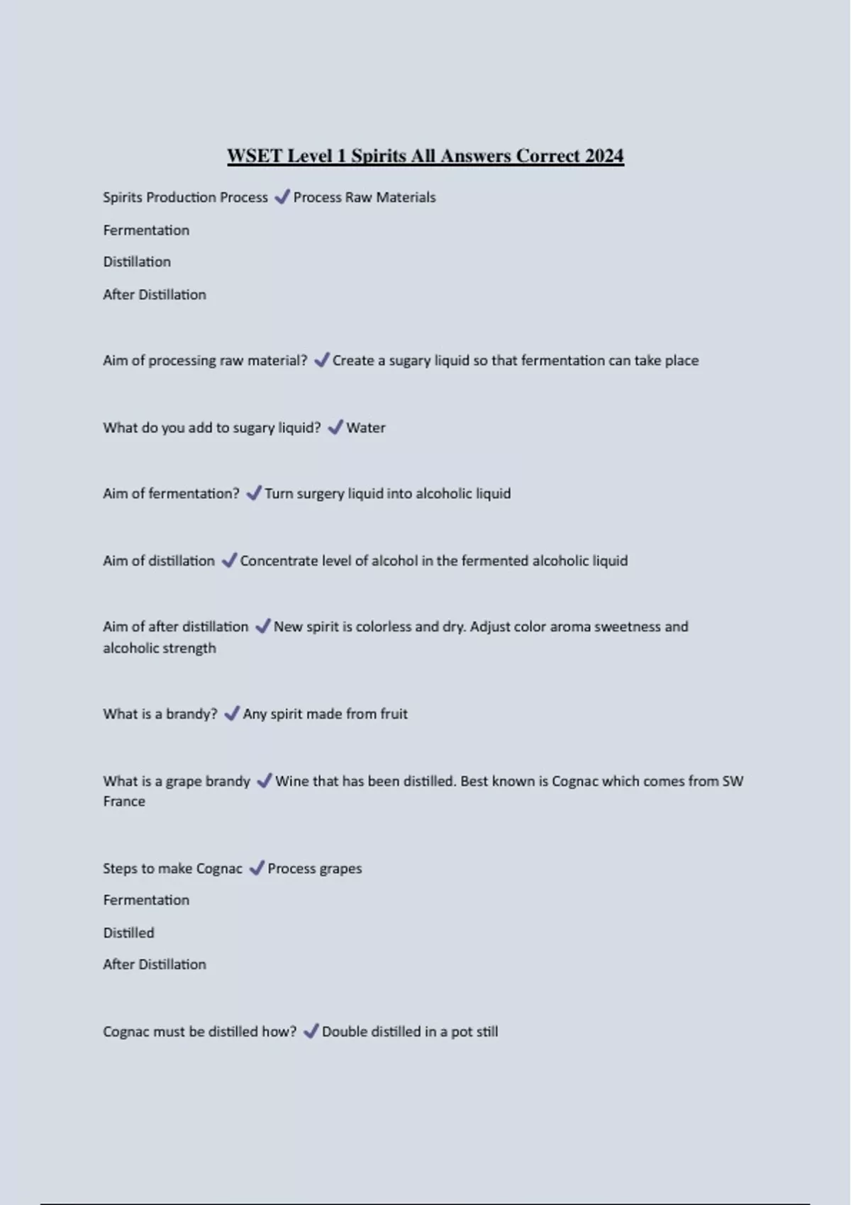 WSET Level 1 Spirits All Answers Correct 2024 Spirits Production Process Fermentation Distillation After Distillation Process Raw Materials Aim of processing raw material? What do you add to sugary liquid? Aim of fermentation? Create a sugary liquid so that fermentation can take place Water Turn surgery liquid into alcoholic liquid Aim of distillation Concentrate level of alcohol in the fermented alcoholic liquid Aim of after distillation alcoholic strength What is a brandy? New spirit is colorless and dry. Adjust color aroma sweetness and Any spirit made from fruit What is a grape brandy France Steps to make Cognac Fermentation Distilled After Distillation Wine that has been distilled. Best known is Cognac which comes from SW Process grapes Cognac must be distilled how? Double distilled in a pot still Pot stills produce what kind of spirits? Low strength, a lot of flavor and character How long must Cognac be aged in oak barrels? What flavor does oak ageing give? At least two years Vanilla and toast, after longer-fruit cake and toffee aromas Types of cognac VSOP XO VS True or false: vodka can be made from any raw material wheat, rye, and potatoes Vodka must be distilled to a strength of at least what? Distillation of vodka? Column still After distillation-vodka is reduced to what abv? Unaged spirits after distillation process 40% True-high quality made from- barley, 95 or 96% Colorless, stores in stainless steel tanks Styles of vodka Neutral vodka Vodka with some character Best known examples of whisky come from where? What is whiskey generally made of? Corn Rye Scotland, USA, Ireland, and Canada Barley Malting- crushed and mixed with water to make How is barley processed to make whiskey? sugary liquid After distillation of whiskey process Blended and colored Diluted to 40% New oak barrel taste for whiskey? Aged in oak Vanilla, cinnamon, cloves, and coconut Does bourbon need to be aged in new oak barrels? What do old oak barrels do to flavor? Yes Less flavor and color Blending a whiskey aims: Complexity Color used in whiskey? Consistency Caramel Scotch whiskey must be aged and distilled for how many years? Single Malt Whiskeys must be: Pot distilled Made from only barley Blend of whiskeys from one distillery Flavor of single malt 3 years in Scotland Cereal, fruits, flowers, honey, fruit cake, sweet spices Why does malt whiskey taste like smoke? Blended scotch whiskies must be: Burning peat A blend of malt whiskeys and grain whiskeys from different distilleries Grain whiskey is distilled how? Column still Number one state for bourbon production? Factors that determine Bourbon: Kentucky 51% of grain must be corn Made using a column still Aged in new oak barrels Flavors of bourbon Sweet corn, cereal, fruit, vanilla, coconut How does Tennessee whiskey differ from Bourbon? f ilter before it is out into oak barrels Does the charcoal add flavor to the whiskey? How does Rye whiskey differ from Bourbon? Scent of rye whiskey Lemon, spicy peppery aromas Raw material used to made rum? Majority of distillers use what raw material? Molasses Taste of sugar cane juice rum? Flavor from molasses rum? Vegetal flavor Grassy flavors What flavor does fermentation bring to rum? Rum distillation options Pot stills-full of flavor Must be passed through a maple charc