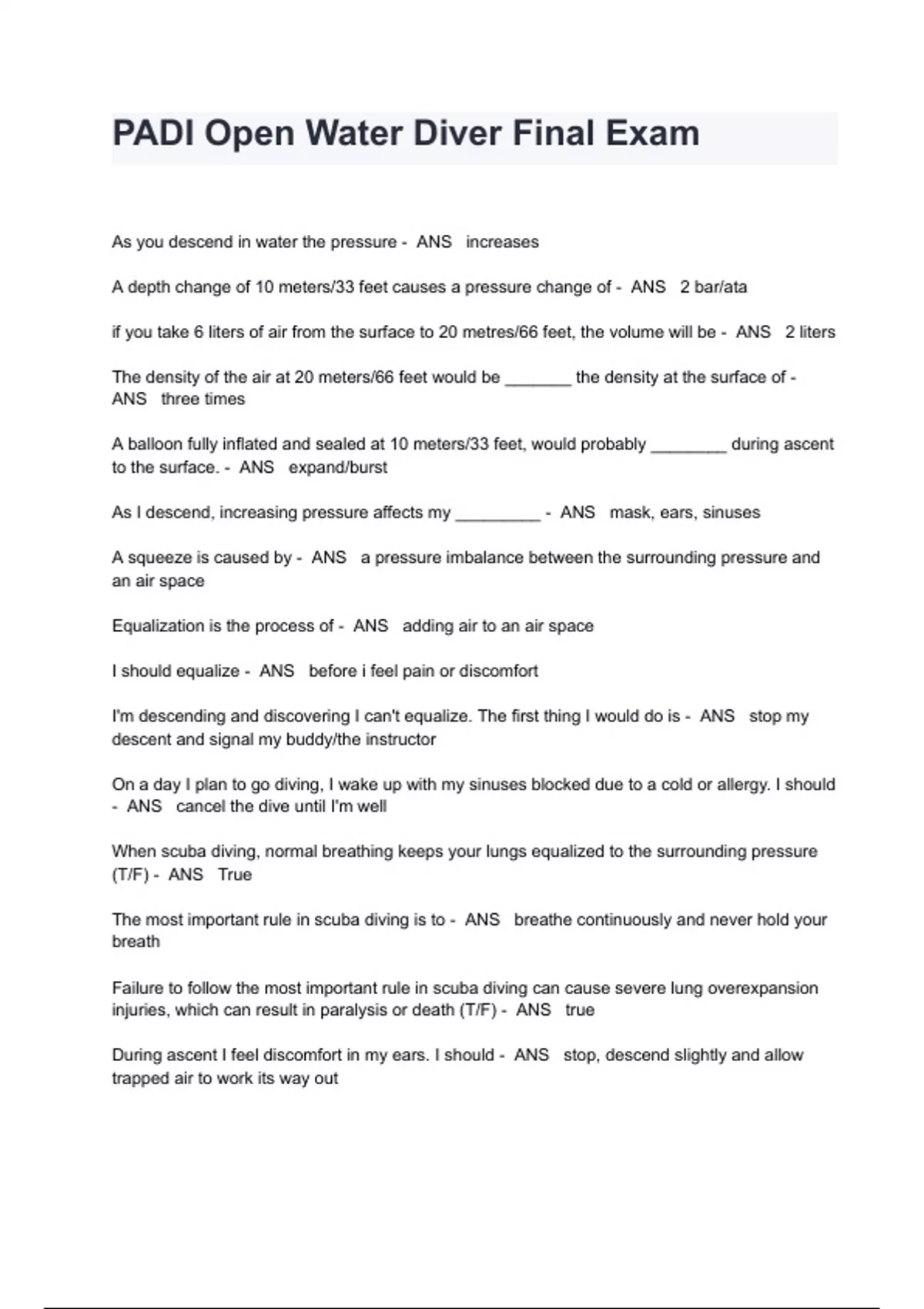 PADI Open Water Diver Final Exam Questions And Answers As you descend in water the pressure - ANS increases A depth change of 10 meters/33 feet causes a pressure change of - ANS 2 bar/ata if you take 6 liters of air from the surface to 20 metres/66 feet, the volume will be - ANS 2 liters The density of the air at 20 meters/66 feet would be _______ the density at the surface of - ANS three times A balloon fully inflated and sealed at 10 meters/33 feet, would probably ________ during ascent to the surface. - ANS expand/burst As I descend, increasing pressure affects my _________ - ANS mask, ears, sinuses A squeeze is caused by - ANS a pressure imbalance between the surrounding pressure and an air space Equalization is the process of - ANS adding air to an air space I should equalize - ANS before i feel pain or discomfort I'm descending and discovering I can't equalize. The first thing I would do is - ANS stop my descent and signal my buddy/the instructor On a day I plan to go diving, I wake up with my sinuses blocked due to a cold or allergy. I should - ANS cancel the dive until I'm well When scuba diving, normal breathing keeps your lungs equalized to the surrounding pressure (T/F) - ANS True The most important rule in scuba diving is to - ANS breathe continuously and never hold your breath Failure to follow the most important rule in scuba diving can cause severe lung overexpansion injuries, which can result in paralysis or death (T/F) - ANS true