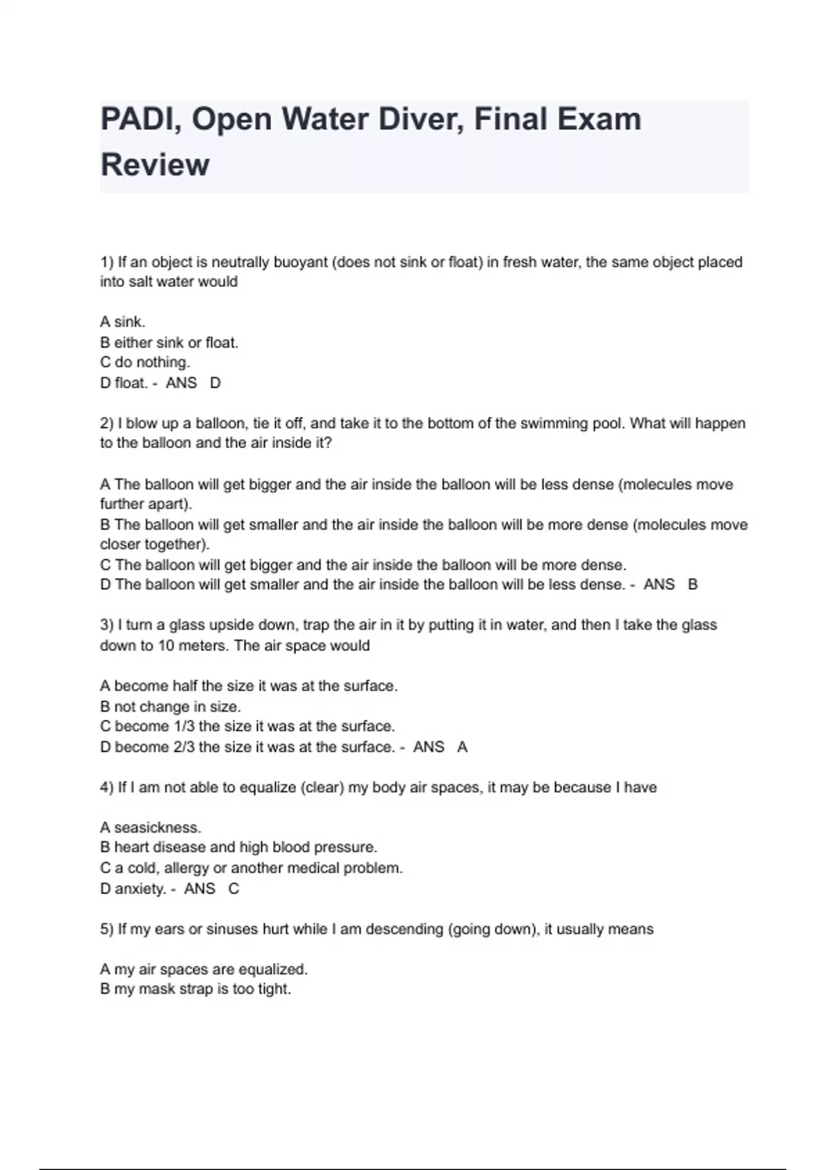 PADI, Open Water Diver, Final Exam Review Questions And Answers 1) If an object is neutrally buoyant (does not sink or float) in fresh water, the same object placed into salt water would A sink. B either sink or float. C do nothing. D float. - ANS D 2) I blow up a balloon, tie it off, and take it to the bottom of the swimming pool. What will happen to the balloon and the air inside it? A The balloon will get bigger and the air inside the balloon will be less dense (molecules move further apart). B The balloon will get smaller and the air inside the balloon will be more dense (molecules move closer together). C The balloon will get bigger and the air inside the balloon will be more dense. D The balloon will get smaller and the air inside the balloon will be less dense. - ANS B 3) I turn a glass upside down, trap the air in it by putting it in water, and then I take the glass down to 10 meters. The air space would A become half the size it was at the surface. B not change in size. C become 1/3 the size it was at the surface. D become 2/3 the size it was at the surface. - ANS A 4) If I am not able to equalize (clear) my body air spaces, it may be because I have A seasickness. B heart disease and high blood pressure. C a cold, allergy or another medical pro