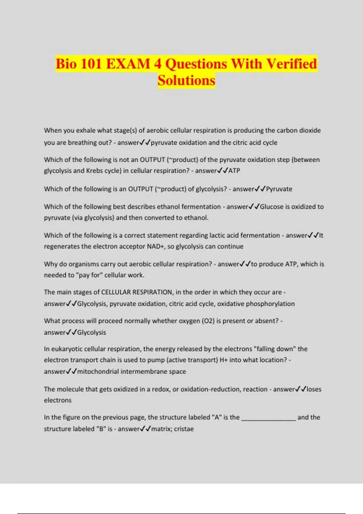 Bio 101 EXAM 4 Questions With Verified Solutions When you exhale what stage(s) of aerobic cellular respiration is producing the carbon dioxide you are breathing out? - answerpyruvate oxidation and the citric acid cycle Which of the following is not an OUTPUT (~product) of the pyruvate oxidation step (between glycolysis and Krebs cycle) in cellular respiration? - answerATP Which of the following is an OUTPUT (~product) of glycolysis? - answerPyruvate Which of the following best describes ethanol fermentation - answerGlucose is oxidized to pyruvate (via glycolysis) and then converted to ethanol. Which of the following is a correct statement regarding lactic acid fermentation - answerIt regenerates the electron acceptor NAD+, so glycolysis can continue Why do organisms carry out aerobic cellular respiration? - answerto produce ATP, which is needed to "pay for" cellular work