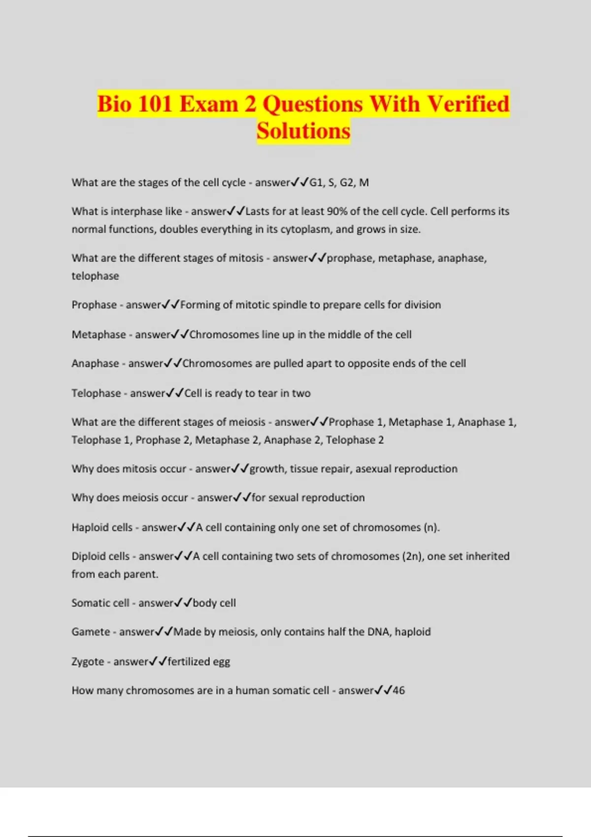 Bio 101 Exam 2 Questions With Verified Solutions What are the stages of the cell cycle - answerG1, S, G2, M What is interphase like - answerLasts for at least 90% of the cell cycle. Cell performs its normal functions, doubles everything in its cytoplasm, and grows in size. What are the different stages of mitosis - answerprophase, metaphase, anaphase, telophase Prophase - answerForming of mitotic spindle to prepare cells for division Metaphase - answerChromosomes line up in the middle of the cell Anaphase - answerChromosomes are pulled apart to opposite ends of the cell Telophase - answerCell is ready to tear in two What are the different stages of meiosis - answerProphase 1, Metaphase 1, Anaphase 1, Telophase 1, Prophase 2, Metaphase 2, Anaphase 2, Telophase 2 Why does mitosis occur - answergrowth, tissue repair, asexual reproduction Why does meiosis occur - answerfor sexual reproduction Haploid cells - answerA cell containing only one set of chromosomes (n). Diploid cells - answerA cell containing two sets of chromosomes (2n), one set inherited from each parent. Somatic cell - answerbody cell Gamete - answerMade by meiosis, only contains half the DNA, haploid Zygote - answerfertilized egg How many chromosomes are in a human somatic cell - answer46