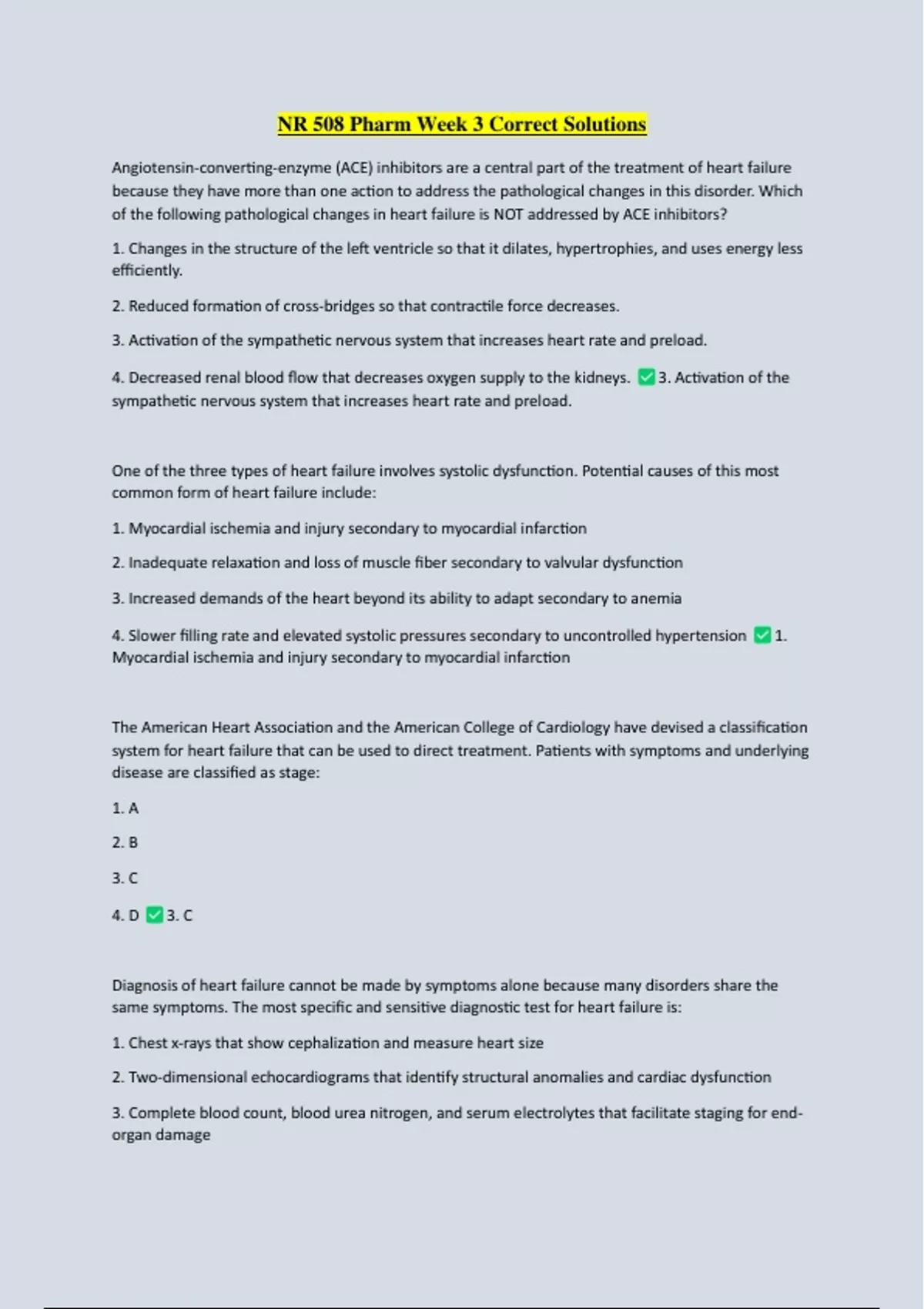 NR 508 Pharm Week 3 Correct Solutions Angiotensin-converting-enzyme (ACE) inhibitors are a central part of the treatment of heart failure because they have more than one action to address the pathological changes in this disorder. Which of the following pathological changes in heart failure is NOT addressed by ACE inhibitors? 1. Changes in the structure of the left ventricle so that it dilates, hypertrophies, and uses energy less efficiently. 2. Reduced formation of cross-bridges so that contractile force decreases. 3. Activation of the sympathetic nervous system that increases heart rate and preload. 4. Decreased renal blood flow that decreases oxygen supply to the kidneys. 3. Activation of the sympathetic nervous system that increases heart rate and preload. One of the three types of heart failure involves systolic dysfunction. Potential causes of this most common form of heart failure include: 1. Myocardial ischemia and injury secondary to myocardial infarction 2. Inadequate relaxation and loss of muscle fiber secondary to valvular dysfunction 3. Increased demands of the heart beyond its ability to adapt secondary to anemia 4. Slower filling rate and elevated systolic pressures secondary to uncontrolled hypertension Myocardial ischemia and injury secondary to myocardial infarction 1. The American Heart Association and the American College of Cardiology have devised a classification system for heart failure that can be used to direct treatment. Patients with symptoms and underlying disease are classified as stage: 1. A 2. B 3. C 4. D 3. C Diagnosis of heart failure cannot be made by symptoms alone because many disorders share the same symptoms. The most specific and sensitive diagnostic test for heart failure is: 1. Chest x-rays that show cephalization and measure heart size 2. Two-dimensional echocardiograms that identify structural anomalies and cardiac dysfunction 3. Complete blood count, blood urea nitrogen, and serum electrolytes that facilitate staging for end organ damage 4. Measurement of brain natriuretic peptide to distinguish between systolic and diastolic dysfunction 2. Two-dimensional echocardiograms that identify structural anomalies and cardiac dysfunction Treatments for heart failure, including drug therapy, are based on the stages developed by the ACC/AHA. Stage A patients are treated with: 1. Drugs for hypertension and hyperlipidemia, if they exist 2. Lifestyle management including diet, exercise, and smoking cessation only 3. Angiotensin-converting enzyme (ACE) inhibitors to directly affect the heart failure only 4. No drugs are used in this early stage 1. Drugs for hypertension and hyperlipidemia, if they exist Class I recommendations for stage A heart failure include: 1. Aerobic exercise within tolerance levels to prevent the development of heart failure 2. Reduction of sodium intake to less than 2,000 mg/day to prevent fluid retention 3. Beta blockers for all patients regardless of cardiac history 4. Treatment of thyroid disorders, especially if they are associated with tachyarrhythmias Treatment of thyroid disorders, especially if they are associated with tachyarrhythmias 4. Stage B patients should have beta blockers added to their heart failure treatment regimen when: 1. They have an ejection fraction less than 40% 2. They have had a recent MI 3. Both 1 and 2 4. Neither 1 nor 2 3. Both 1 and 2 Increased life expectancy for patients with heart failure has been associated with the use of: 1. ACE inhibitors, especially when started early in the disease process 2. All beta blockers regardless of selectivity 3. Thiazide and loop diuretics 4. Cardiac glycosides 1. ACE inhibitors, especially when started early in the disease process Stage C patients usually require a combination of three to four drugs to manage their heart failure. In addition to ACE inhibitors and beta blockers, diuretics may be added. Which of the following statements about diuretics is NOT true? 1. Diuretics reduce preload associated with fluid retention. 2. Diuretics can be used earlier than stage C when the goal is control of hypertension. 3. Diuretics may produce problems with electrolyte imbalances and abnormal glucose and lipid metabolism. 4. Diuretics from the potassium-sparing class should be used when using an angiotensin receptor blocker (ARB). 4. Diuretics from the potassium-sparing class should be used when using an angiotensin receptor blocker (ARB). Digoxin has a very limited role in treatment of heart failure. It is used mainly for patients with: 1. Ejection fractions above 40% 2. An audible S3 3. Mitral stenosis as a primary cause for heart failure 4. Renal insufficiency 2. An audible S3 Which of the following classes of drugs is contraindicated in heart failure? 1. Nitrates 2. Long-acting dihydropyridines 3. Calcium channel blockers 4. Alpha-beta blockers 3. Calcium channel blockers Heart failure is a leading cause of death and hospitalization in older adults (greater than 65 years old). The drug of choice for this population is: 1. Aldosterone antagonists 2. Eplerenone 3. ACE inhibitors 4. ARBs 3. ACE inhibitors ACE inhibitors are contraindicated in pregnancy. While treatment of heart failure during pregnancy is best done by a specialist, which of the following drug classes is considered to be safe, at least in the later parts of pregnancy? 1. Diuretics 2. ARBs 3. Beta blockers 4. Nitrates 3. Beta blockers Heart failure is a chronic condition that can be adequately managed in primary care. However, consultation with or referral to a cardiologist is appropriate when: 1. Symptoms markedly worsen or the patient becomes hypotensive and has syncope 2. There is evidence of progressive renal insufficiency or failure 3. The patient remains symptomatic on optimal doses of an ACE inhibitor, a beta blocker, and a diuretic 4. Any of the above 4. Any of the above ACE inhibitors are a foundational medication in HF. Which group of patients cannot take them safely? 1. Elderly patients with reduced 