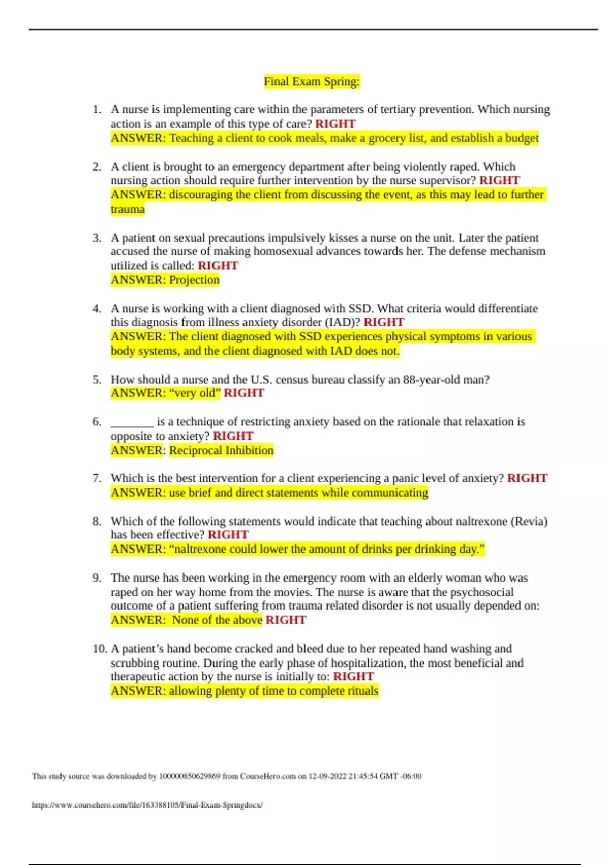A nurse is implementing care within the parameters of tertiary prevention. Which nursing action is an example of this type of care? RIGHT ANSWER: Teaching a client to cook meals, make a grocery list, and establish a budget 2. A client is brought to an emergency department after being violently raped. Which nursing action should require further intervention by the nurse supervisor? RIGHT ANSWER: discouraging the client from discussing the event, as this may lead to further trauma 3. A patient on sexual precautions impulsively kisses a nurse on the unit. Later the patient accused the nurse of making homosexual advances towards her. The defense mechanism utilized is called: RIGHT ANSWER: Projection 4. A nurse is working with a client diagnosed with SSD. What criteria would differentiate this diagnosis from illness anxiety disorder (IAD)? RIGHT ANSWER: The client diagnosed with SSD experiences physical symptoms in various body systems, and the client diagnosed with IAD does not. 5. How should a nurse and the U.S. census bureau classify an 88-year-old man? ANSWER: “very old” RIGHT 6. _______ is a technique of restricting anxiety based on the rationale that relaxation is opposite to anxiety? RIGHT ANSWER: Reciprocal Inhibition 7. Which is the best intervention for a client experiencing a panic level of anxiety? RIGHT ANSWER: use brief and direct statements while communicating 8. Which of the following statements would indicate that teaching about naltrexone (Revia) has been effective? RIGHT ANSWER: “naltrexone could lower the amount of drinks per drinking day.” 9. The nurse has been working in the emergency room with an elderly woman who was raped on her way home from the movies. The nurse is aware that the psychosocial outcome of a patient suffering from trauma related disorder is not usually depended on: ANSWER: None of the above RIGHT 10. A patient’s hand become cracked and bleed due to her repeated hand washing and scrubbing routine. During the early phase of hospitalization, the most beneficial and therapeutic action by the nurse is initially to: RIGHT ANSWER: allowing plenty of time to complete rituals