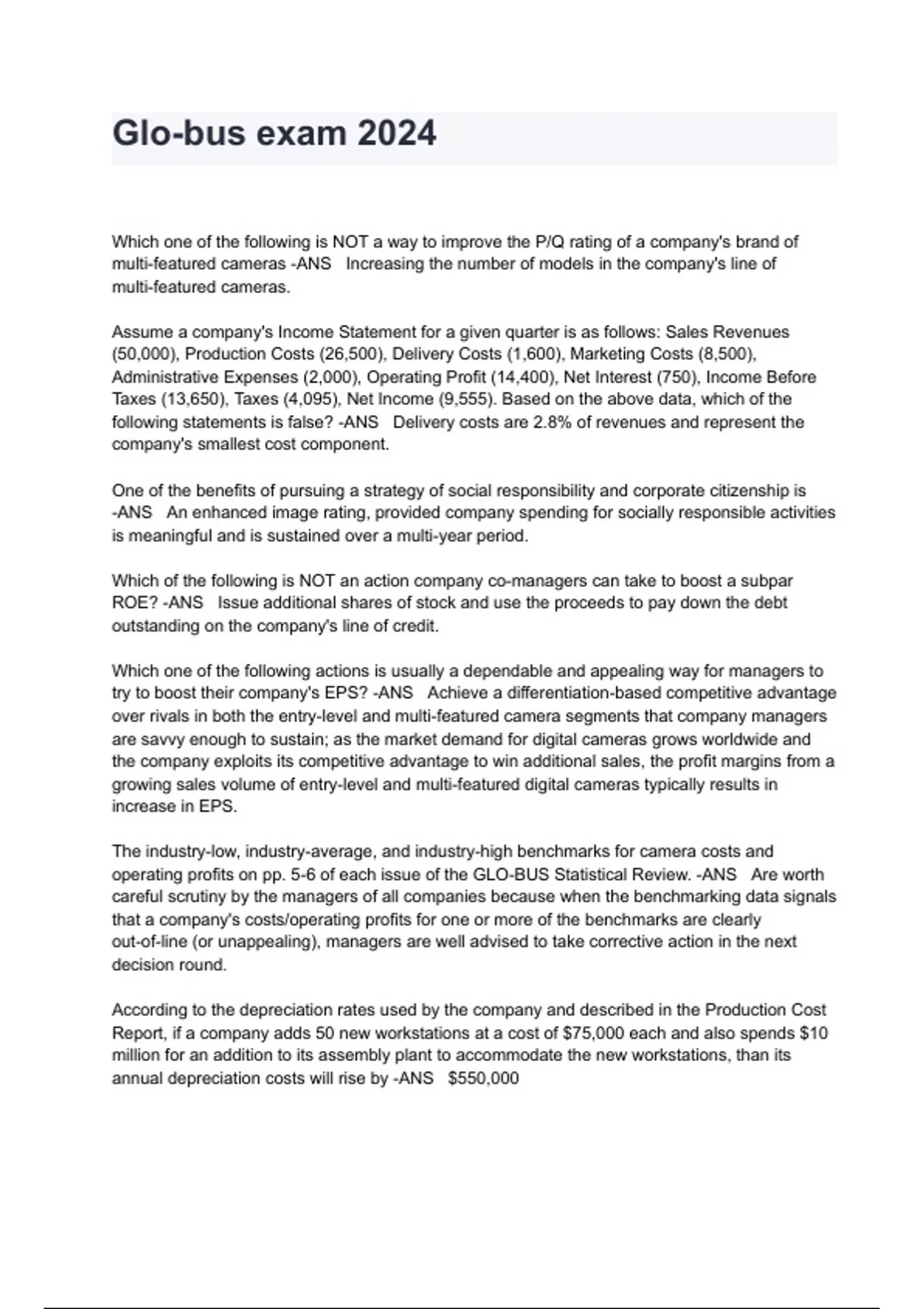 Glo-bus exam 2024 Which one of the following is NOT a way to improve the P/Q rating of a company's brand of multi-featured cameras -ANS Increasing the number of models in the company's line of multi-featured cameras. Assume a company's Income Statement for a given quarter is as follows: Sales Revenues (50,000), Production Costs (26,500), Delivery Costs (1,600), Marketing Costs (8,500), Administrative Expenses (2,000), Operating Profit (14,400), Net Interest (750), Income Before Taxes (13,650), Taxes (4,095), Net Income (9,555). Based on the above data, which of the following statements is false? -ANS Delivery costs are 2.8% of revenues and represent the company's smallest cost component. One of the benefits of pursuing a strategy of social responsibility and corporate citizenship is -ANS An enhanced image rating, provided company spending for socially responsible activities is meaningful and is sustained over a multi-year period. Which of the following is NOT an action company co-managers can take to boost a subpar ROE? -ANS Issue additional shares of stock and use the proceeds to pay down the debt outstanding on the company's line of credit. Which one of the following actions is usually a dependable and appealing way for managers to try to boost their company's EPS? -ANS Achieve a differentiation-based competitive advantage over rivals in both the entry-level and multi-featured camera segments that company managers are savvy enough to sustain; as the market demand for digital cameras grows worldwide and the company exploits its competitive advantage to win additional sales, the profit margins from a growing sales volume of entry-level and multi-featured digital cameras typically results in increase in EPS. The industry-low, industry-average, and industry-high benchmarks for camera costs and operating profits on pp. 5-6 of each issue of the GLO-BUS Statistical Review. -ANS Are worth careful scrutiny by the managers of all companies because when the benchmarking data signals that a company's costs/operating profits for one or more of the benchmarks are clearly out-of-line (or unappealing), managers are well advised to take corrective action in the next decision round. According to the depreciation rates used by the company and described in the Production Cost Report, if a company adds 50 new workstations at a cost of $75,000 each and also spends $10 million for an addition to its assembly plant to accommodate the new workstations, than its annual depreciation costs will rise by -ANS $550,000 Assume a company's Income Statement for a given period has the following entries: Sales Revenues (50,000), Production Costs (26,500), Delivery Costs (1,600), Marketing Costs (8,500), Administrative Expenses (3,000), Operating Profit (13,400), Net Interest (750), Income Before Taxes (12,650), Taxes (3,795), Net Income (8,855). Based on the above income statement data, the company's operating profit margin and net profit margin are -ANS 26.8% and 17.7%. Which of the following sets of actions are unlikely to help a company achieve a differentiation-based competitive advantage over some/many of its rivals that are marketing entry-level cameras? -ANS Actions to raise the base pay of PAT members by 10% or more each year, charging prices for entry-level cameras that are $5 or more above any other company in that industry in all four geographic regions, and spending more on new product R&D per entry-level camera that is the highest in the industry (as reported on p. 5 of each issue of the GLO-BUS Statistical Review.) Which one of the following actions does NOT result in higher levels of PAT labor productivity in assembling cameras? -ANS Avoiding contracting the assembly of cameras to outside suppliers/contractors. Which of the following actions does not help make a company's brand of multi-featured cameras more competitive and attractive to buyers vis-a-vis the brands of rival firms? -ANS Increasing total compensation of PAT members to boost their productivity in assembling multi-featured cameras. Which of the following is an action company co-managers should seriously consider in trying to improve the company's credit rating? You may wish to consult the discussion of the credit rating that appears on the Help screen for the Comparative Financial Performance page of the GSR in answering this question. -ANS Issue additional shares of stock and use the proceeds to pay down the loans on the company's line of credit. Given the following Financial Statement Data: Sales Revenues (50,000), Operating Profit (14,400), Net Income (9,555), Total Current Assets (70,000), Total Assets (159,000), Total Current Liabilities (26,000), L-T Debt (43,000), Total Equity (91,400), Depreciation (4,000), Dividend Payments (2,250). Based on the above figures, the company's capital structure (defined as the sum of total debt outstanding and total stockholder's equity) consists of what percentages of debt and equity? (The percentages of total capital invested that are debt-financed and equity-financed are among the factors used to determine a company's credit rating, as explained in the Help section for the Comparative Financial Performances presented on p.7 of the GLO-BUS Statistical Review.) -ANS 32% debt and 685 equity or 32:68. In which one of the following situations/circumstances is it most reasonable for a company to consider shifting away from pursuit of a strategy to strongly differentiate its multi-featured cameras from the multi-featured camera brands of rival companies and sell them at a premium price? -ANS When the market for high-end multi-featured cameras is crowded with companies using more or less copycat differentiation strategies to try to outcompete one another, thus making it difficult for any of these companies to earn attractively high profits. According to explanations provided on the Help screens for the Production Cost Report, if a company pays a PAT member a base wage of $18,000, a $60 quarterly bonus for per