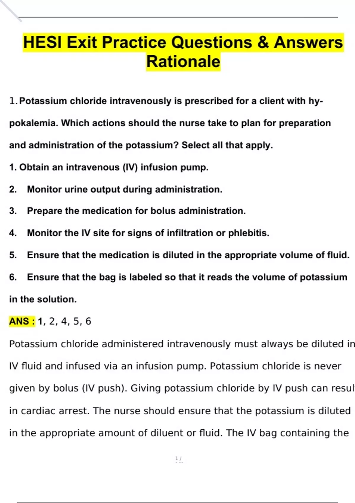 1. Potassium chloride intravenously is prescribed for a client with hy- pokalemia. Which actions should the nurse take to plan for preparation and administration of the potassium? Select all that apply. 1. Obtain an intravenous (IV) infusion pump. 2. Monitor urine output during administration. 3. Prepare the medication for bolus administration. 4. Monitor the IV site for signs of infiltration or phlebitis. 5. Ensure that the medication is diluted in the appropriate volume of fluid. 6. Ensure that the bag is labeled so that it reads the volume of potassium in the solution. ANS : 1, 2, 4, 5, 6 Potassium chloride administered intravenously must always be diluted in IV fluid and infused via an infusion pump. Potassium chloride is never given by bolus (IV push). Giving potassium chloride by IV push can result in cardiac arrest. The nurse should ensure that the potassium is diluted in the appropriate amount of diluent or fluid. The IV bag containing the potassium chloride should always be labeled with the volume of potassium it contains. The IV site is monitored closely because potassium chloride is irritating to the veins and there is risk of phlebitis. In addition, the nurse should monitor for infiltration. The nurse monitors urinary output during administration and contacts the health care provider if the urinary output is less than 30 mL/hour. 2. A client admitted to the hospital with chest pain and a history of type 2 diabetes mellitus is scheduled for cardiac catheterization. Which medication would need to be withheld for 24 hours before the procedure and for 48 hours after the procedure? 1. Glipizide 2.Metformin 3.Repaglinide 4.Regular insulin ANS : 2 Metformin needs to be withheld 24 hours before and for 48 hours after cardiac catheterization because of the injection of contrast medium during the procedure. If the contrast medium affects kidney function, with metformin in the system the client would be at increased risk for lactic acidosis. The medications in the remaining options do not need to be withheld 24 hours before and 48 hours after cardiac catheterizatio