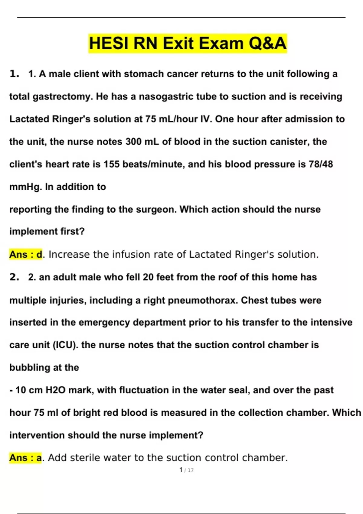 1. 1. A male client with stomach cancer returns to the unit following a total gastrectomy. He has a nasogastric tube to suction and is receiving Lactated Ringer's solution at 75 mL/hour IV. One hour after admission to the unit, the nurse notes 300 mL of blood in the suction canister, the client's heart rate is 155 beats/minute, and his blood pressure is 78/48 mmHg. In addition to reporting the finding to the surgeon. Which action should the nurse implement first? Ans : d. Increase the infusion rate of Lactated Ringer's solution. 2. 2. an adult male who fell 20 feet from the roof of this home has multiple injuries, including a right pneumothorax. Chest tubes were inserted in the emergency department prior to his transfer to the intensive care unit (ICU). the nurse notes that the suction control chamber is bubbling at the - 10 cm H2O mark, with fluctuation in the water seal, and over the past hour 75 ml of bright red blood is measured in the collection chamber. Which intervention should the nurse implement? Ans : a. Add sterile water to the suction control chamber. 3. A client who received hemodialysis yesterday is experiencing a blood pressure of 200/100 mmHg, heart rate 110 beats/minute, and respiratory rate 36 breaths/minute. The client is manifesting shortness of breath, bilateral 2+ pedal edema, and an oxygen saturation on room air of 89%. Which action should the nurse take first? Ans : c. Begin supplemental oxygen