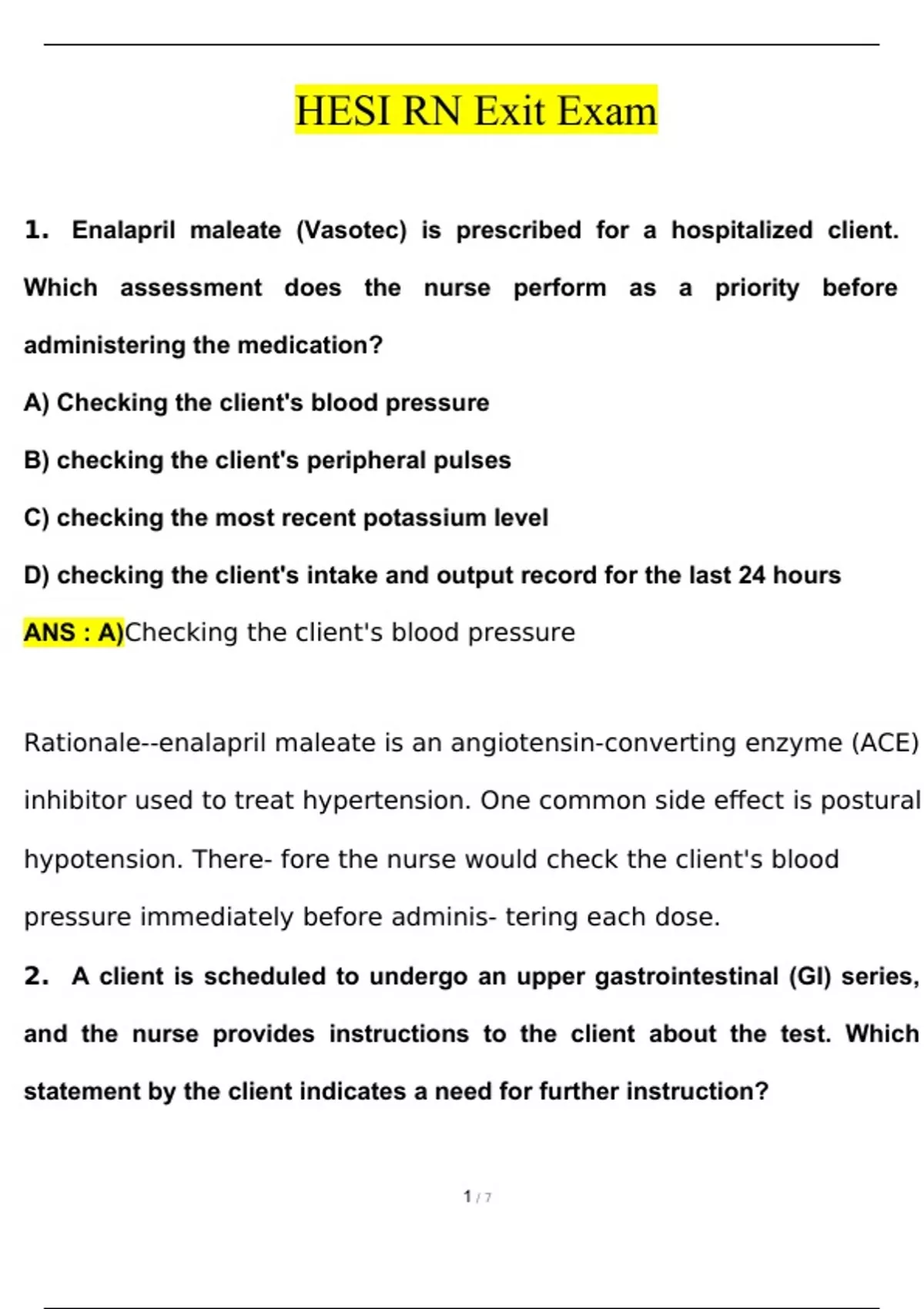 1. Enalapril maleate (Vasotec) is prescribed for a hospitalized client.