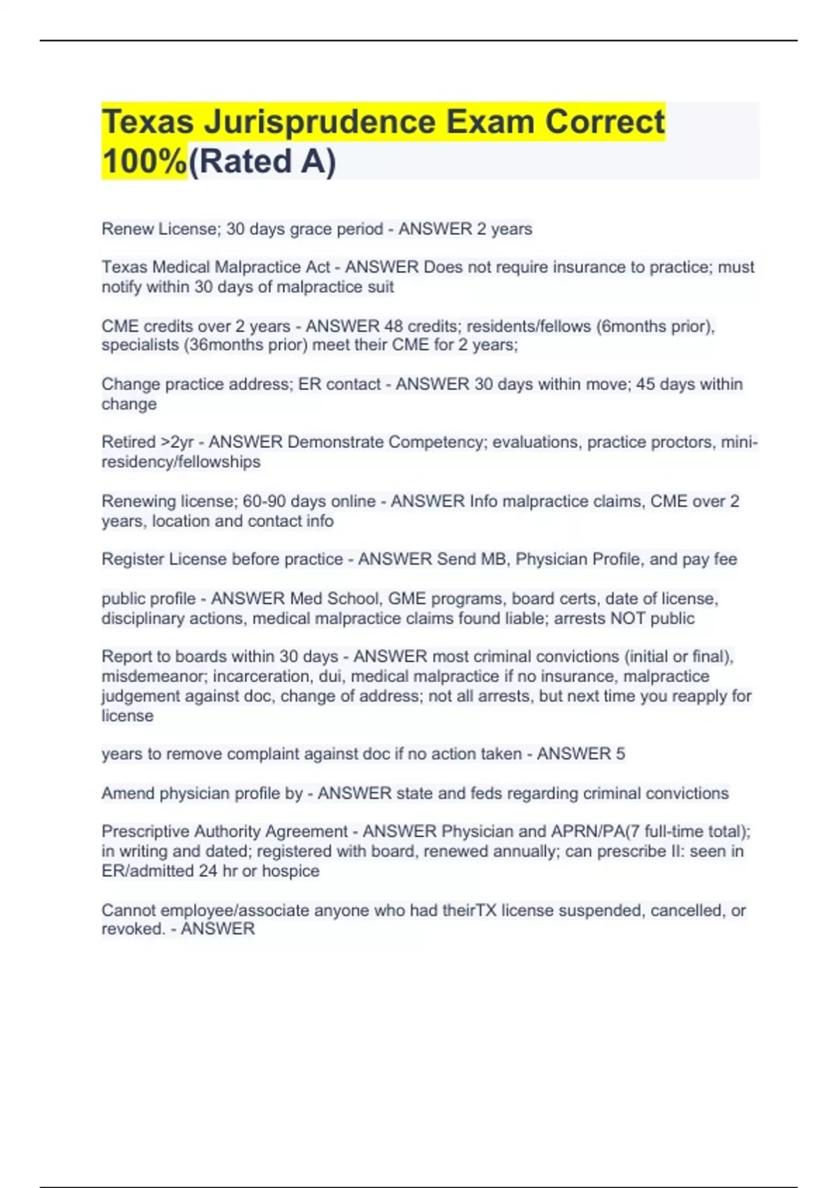 Texas Jurisprudence Exam Correct 100%(Rated A) Renew License; 30 days grace period - ANSWER 2 years Texas Medical Malpractice Act - ANSWER Does not require insurance to practice; must notify within 30 days of malpractice suit CME credits over 2 years - ANSWER 48 credits; residents/fellows (6months prior), specialists (36months prior) meet their CME for 2 years; Change practice address; ER contact - ANSWER 30 days within move; 45 days within change Retired 2yr - ANSWER Demonstrate Competency; evaluations, practice proctors, mini-residency/fellowships Renewing license; 60-90 days online - ANSWER Info malpractice claims, CME over 2 years, location and contact info Register License before practice - ANSWER Send MB, Physician Profile, and pay fee public profile - ANSWER Med School, GME programs, board certs, date of license, disciplinary