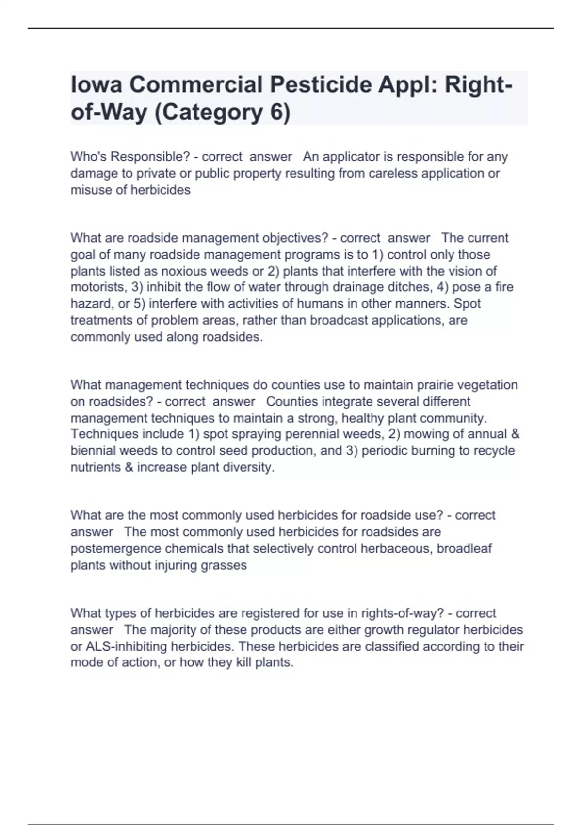 Iowa Commercial Pesticide Appl Question and answers correctly solved 2024Who's Responsible? - correct answer An applicator is responsible for any damage to private or public property resulting from careless application or misuse of herbicides What are roadside management objectives? - correct answer The current goal of many roadside management programs is to 1) control only those plants listed as noxious weeds or 2) plants that interfere with the vision of motorists, 3) inhibit the flow of water through drainage ditches, 4) pose a fire hazard, or 5) interfere with activities of humans in other manners. Spot treatments of problem areas, rather than broadcast applications, are commonly used along roadsides. What management techniques do counties use to maintain prairie vegetation on roadsides? - correct answer Counties integrate several different management techniques to maintain a strong, healthy plant community. Techniques include 1) spot spraying perennial weeds, 2) mowing of annual & biennial weeds t