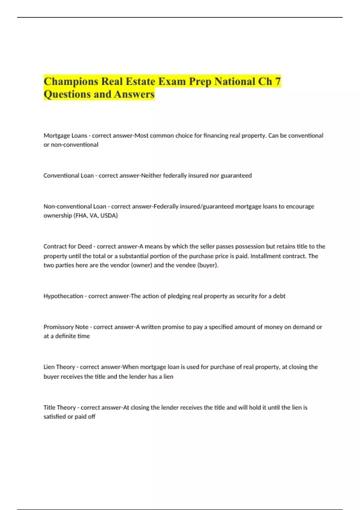 Mortgage Loans - correct answer-Most common choice for financing real property. Can be conventional or non-conventional Conventional Loan - correct answer-Neither federally insured nor guaranteed Non-conventional Loan - correct answer-Federally insured/guaranteed mortgage loans to encourage ownership (FHA, VA, USDA) Contract for Deed - correct answer-A means by which the seller passes possession but retains title to the property until the total or a substantial portion of the purchase price is paid. Installment contract. The two parties here are the vendor (owner) and the vendee (buyer). Hypothecation - correct answer-The action of pledging real property as security for a debt Promissory Note - correct answer-A written promise to pay a specified amount of money on demand or at a definite time Lien Theory - correct answer-When mortgage loan is used for purchase of real property, at closing the buyer receives the title and the lender has a lien Title Theory - correct answer-At closing the lender receives the title and will hold it until the lien is satisfied or paid off