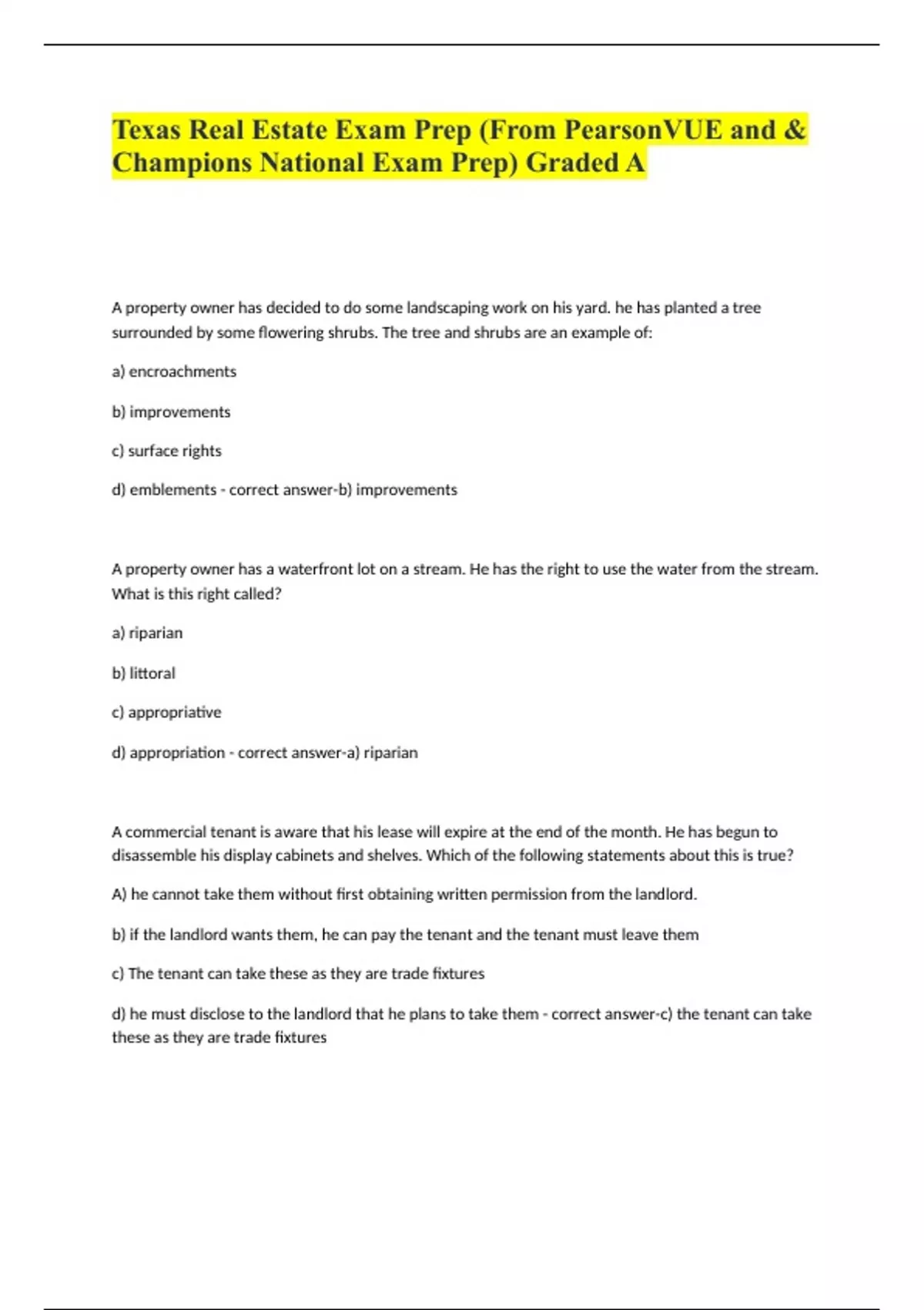 A property owner has decided to do some landscaping work on his yard. he has planted a tree surrounded by some flowering shrubs. The tree and shrubs are an example of: a) encroachments b) improvements c) surface rights d) emblements - correct answer-b) improvements A property owner has a waterfront lot on a stream. He has the right to use the water from the stream. What is this right called? a) riparian b) littoral c) appropriative d) appropriation - correct answer-a) riparian A commercial tenant is aware that his lease will expire at the end of the month. He has begun to disassemble his display cabinets and shelves. Which of the following statements about this is true? A) he cannot take them without first obtaining written permission from the landlord. b) if the landlord wants them, he can pay the tenant and the tenant must leave them c) The tenant can take these as they are trade fixtures d) he must disclose to the landlord that he plans to take them - correct answer-c) the tenant can take these as they are trade fixtures