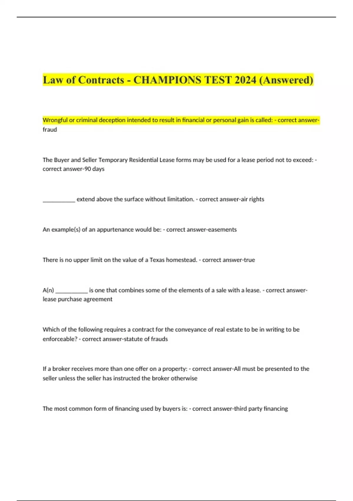 Law of Contracts - CHAMPIONS TEST 2024 (Answered)