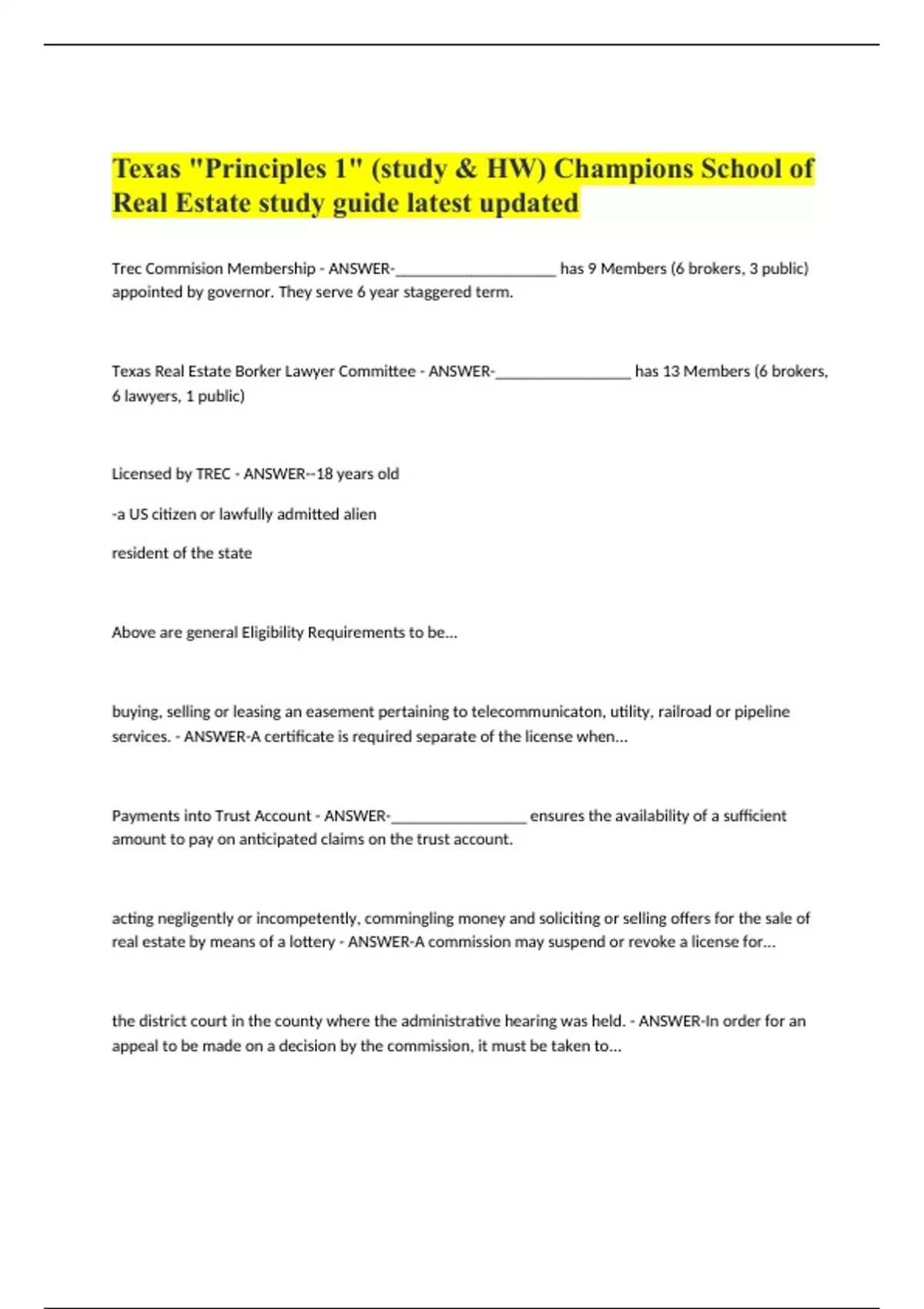 Trec Commision Membership - ANSWER-___________________ has 9 Members (6 brokers, 3 public) appointed by governor. They serve 6 year staggered term. Texas Real Estate Borker Lawyer Committee - ANSWER-________________ has 13 Members (6 brokers, 6 lawyers, 1 public) Licensed by TREC - ANSWER--18 years old -a US citizen or lawfully admitted alien resident of the state Above are general Eligibility Requirements to be... buying, selling or leasing an easement pertaining to telecommunicaton, utility, railroad or pipeline services. - ANSWER-A certificate is required separate of the license when... Payments into Trust Account - ANSWER-________________ ensures the availability of a sufficient amount to pay on anticipated claims on the trust account. acting negligently or incompetently, commingling money and soliciting or selling offers for the sale of real estate by means of a lottery - ANSWER-A commission may suspend or revoke a license for... the district court in the county where the administrative hearing was held. - ANSWER-In order for an appeal to be made on a decision by the commission, it must be taken to...