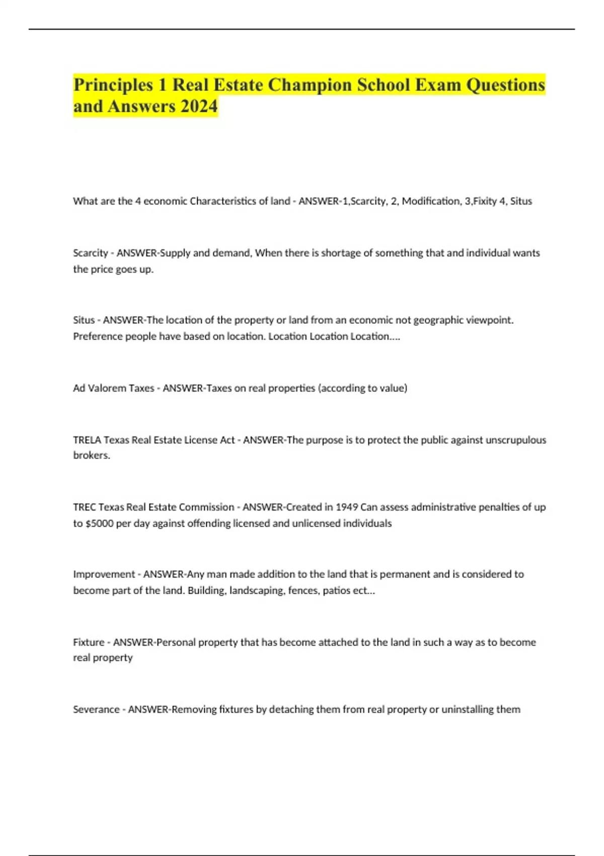 Principles 1 Real Estate Champion School Exam Questions and Answers 2024