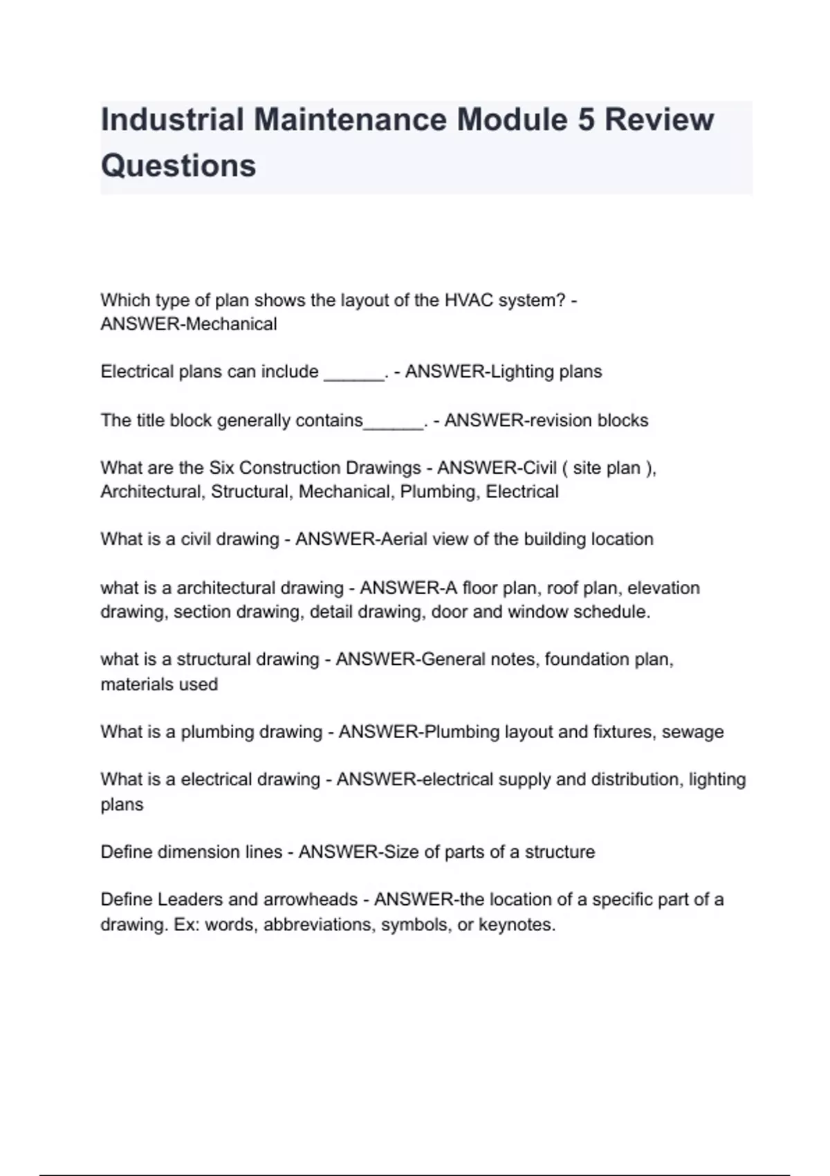 Which type of plan shows the layout of the HVAC system? - ANSWER-Mechanical Electrical plans can include ______. - ANSWER-Lighting plans The title block generally contains______. - ANSWER-revision blocks What are the Six Construction Drawings - ANSWER-Civil ( site plan ), Architectural, Structural, Mechanical, Plumbing, Electrical What is a civil drawing - ANSWER-Aerial view of the building location what is a architectural drawing - ANSWER-A floor plan, roof plan, elevation drawing, section drawing, detail drawing, door and window schedule. what is a structural drawing - ANSWER-General notes, foundation plan, materials used What is a plumbing drawing - ANSWER-Plumbing layout and fixtures, sewage What is a electrical drawing - ANSWER-electrical supply and distribution, lighting plans Define dimension lines - ANSWER-Size of parts of a structure Define Leaders and arrowheads - ANSWER-the location of a specific part of a drawing.