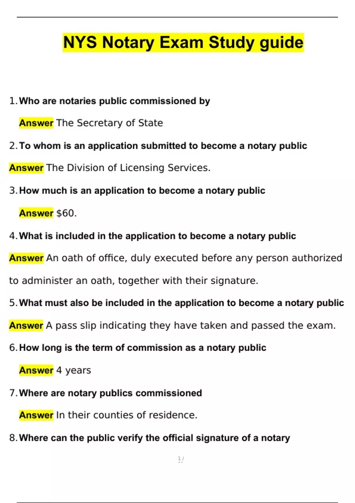 1. Who are notaries public commissioned by Answer The Secretary of State 2. To whom is an application submitted to become a notary public Answer The Division of Licensing Services. 3. How much is an application to become a notary public Answer $60. 4. What is included in the application to become a notary public Answer An oath of office, duly executed before any person authorized to administer an oath, together with their signature. 5. What must also be included in the application to become a notary public Answer A pass slip indicating they have taken and passed the exam. 6. How long is the term of commission as a notary public Answer 4 years 7. Where are notary publics commissioned Answer In their counties of residence. 8. Where can the public verify the official signature of a notary Answer The county clerk's office. 9. When is authentication of a notary's signature obtained Answer When a document will be used outside the State. What should notaries do when they expect to sign documents regularly in counties other than their residence Answer File a certificate of official character with other New York state county clerks.