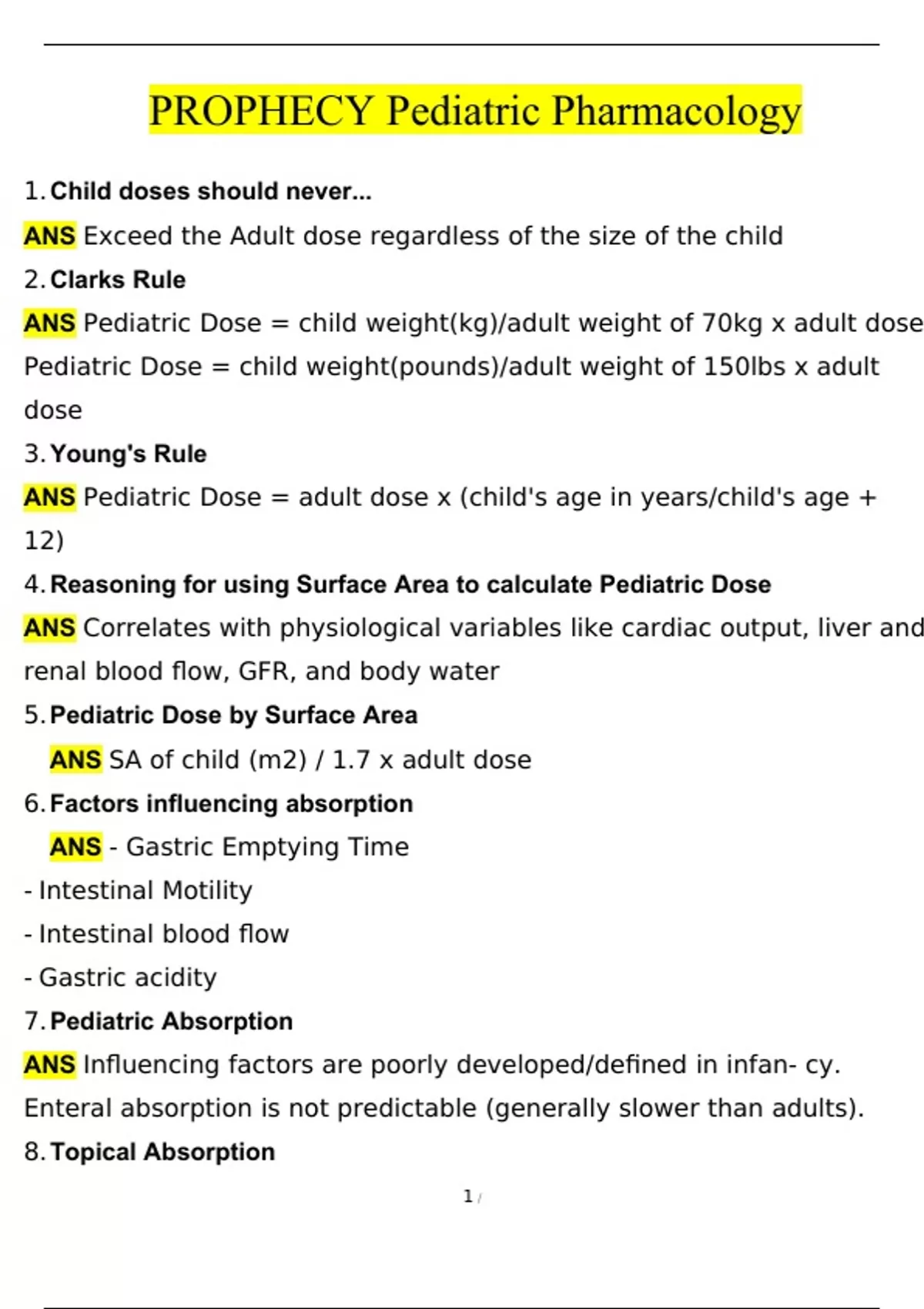 1. Child doses should never... ANS Exceed the Adult dose regardless of the size of the child 2. Clarks Rule ANS Pediatric Dose = child weight(kg)/adult weight of 70kg x adult dose Pediatric Dose = child weight(pounds)/adult weight of 150lbs x adult dose 3. Young's Rule ANS Pediatric Dose = adult dose x (child's age in years/child's age + 12) 4. Reasoning for using Surface Area to calculate Pediatric Dose ANS Correlates with physiological variables like cardiac output, liver and renal blood flow, GFR, and body water 5. Pediatric Dose by Surface Area ANS SA of child (m2) / 1.7 x adult dose 6. Factors influencing absorption ANS - Gastric Emptying Time - Intestinal Motility - Intestinal blood flow - Gastric acidity 7. Pediatric Absorption ANS Influencing factors are poorly developed/defined in infan- cy. Enteral absorption is not predictable (generally slower than adults). 8. Topical Absorption ANS Much greater in children than adults, especially high in neonates. Only pharmacokinetic parameter that will INCREASE in children. 9. Pediatric Distribution ANS Increased total body water (extracellular water) in infants and children results in lower peak levels of water soluble drugs. Body fat will increase with age. Pediatric Metabolism ANS Neonatal hepatic function is underdeveloped. Results in prolonged half-lifes of drugs being oxidized (lidocaine, during undergoing glu- curonidation-phase II reactions)