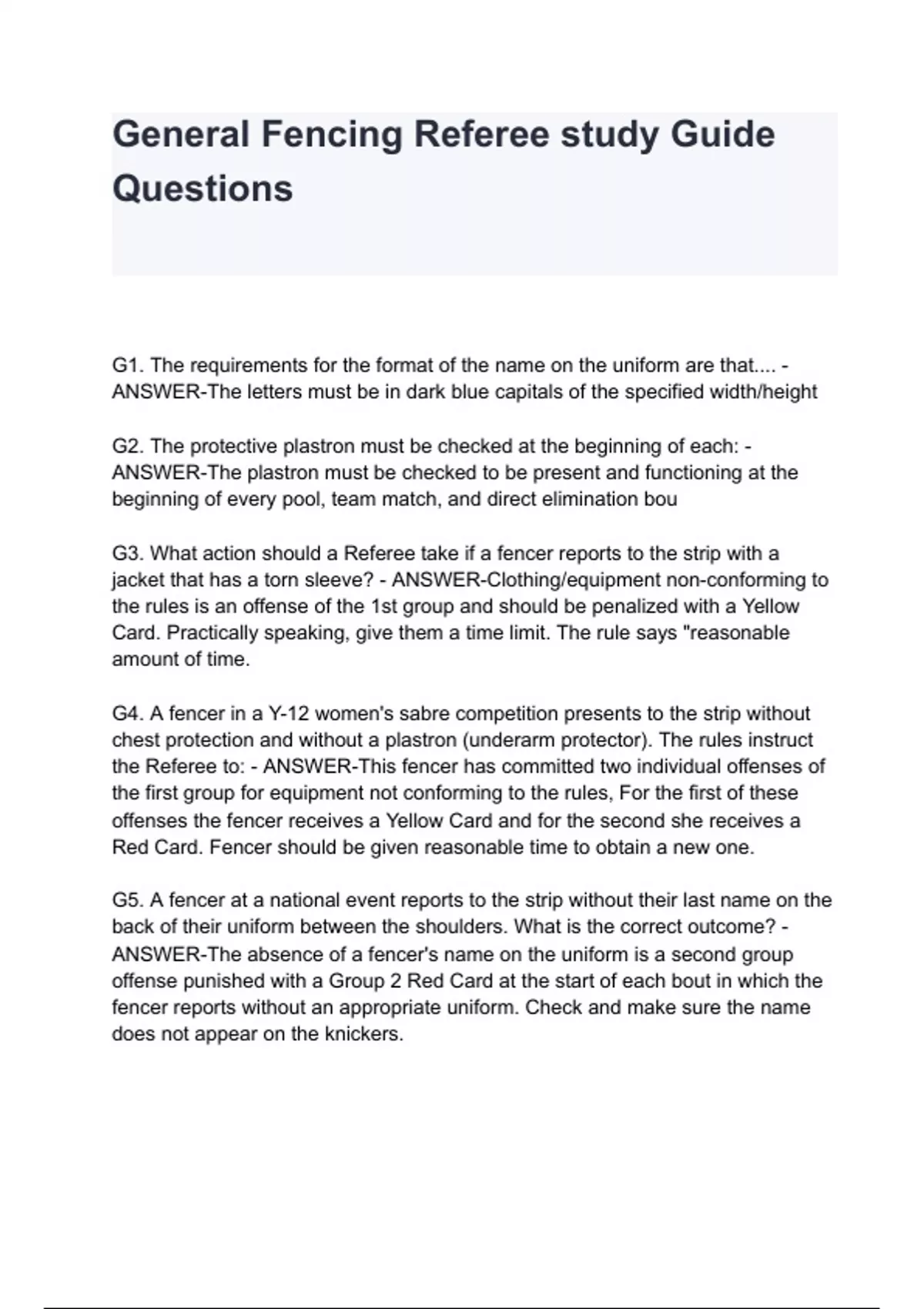 G1. The requirements for the format of the name on the uniform are that.... - ANSWER-The letters must be in dark blue capitals of the specified width/height G2. The protective plastron must be checked at the beginning of each: - ANSWER-The plastron must be checked to be present and functioning at the beginning of every pool, team match, and direct elimination bou G3. What action should a Referee take if a fencer reports to the strip with a jacket that has a torn sleeve? - ANSWER-Clothing/equipment non-conforming to the rules is an offense of the 1st group and should be penalized with a Yellow Card. Practically speaking, give them a time limit. The rule says "reasonable amount of time. G4. A fencer in a Y-12 women's sabre competition presents to the strip without chest protection and without a plastron (underarm protector). The rules instruct the Referee to: - ANSWER-This fencer has committed two individual offenses of the first group for equipment not conforming to the rules, For the first of these offenses the fencer receives a Yellow Card and for the second she receives a Red Card. Fencer should be given reasonable time to obtain a new one. G5. A fencer at a national event reports to the strip without their last name on the back of their uniform between the shoulders. What is the correct outcome? - ANSWER-The absence of a fencer's name on the uniform is a second group offense punished with a Group 2 Red Card at the start of each bout in which the f