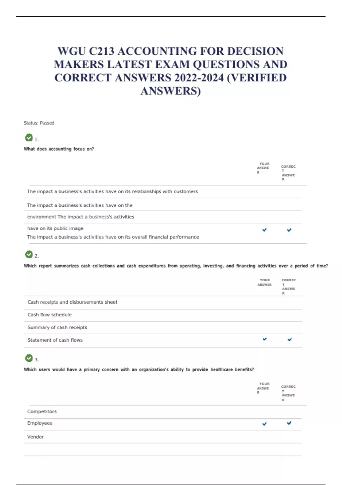 WGU C213 ACCOUNTING FOR DECISION MAKERS LATEST EXAM QUESTIONS AND CORRECT ANSWERS