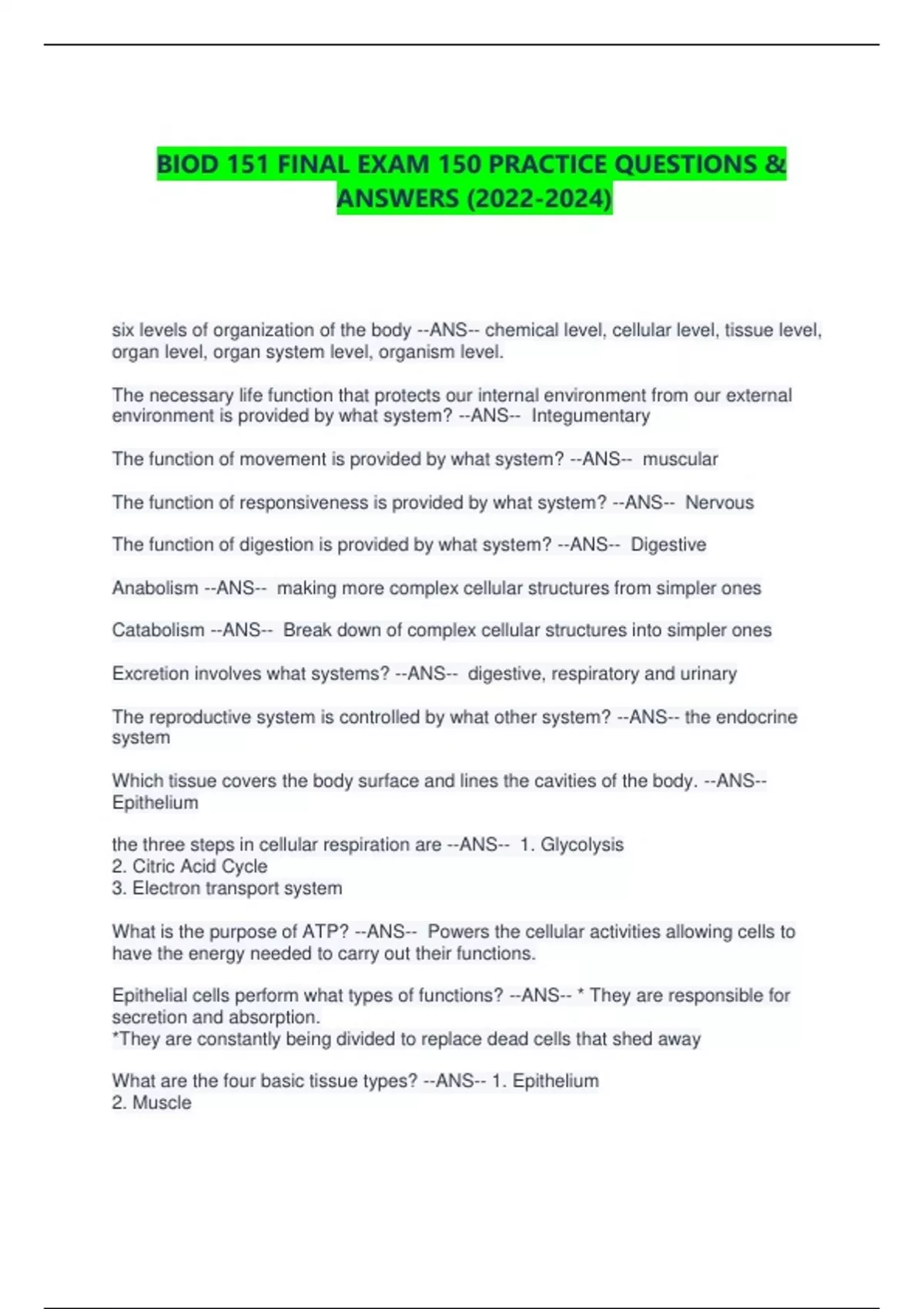 BIOD 151 FINAL EXAM 150 PRACTICE QUESTIONS & ANSWERS ()