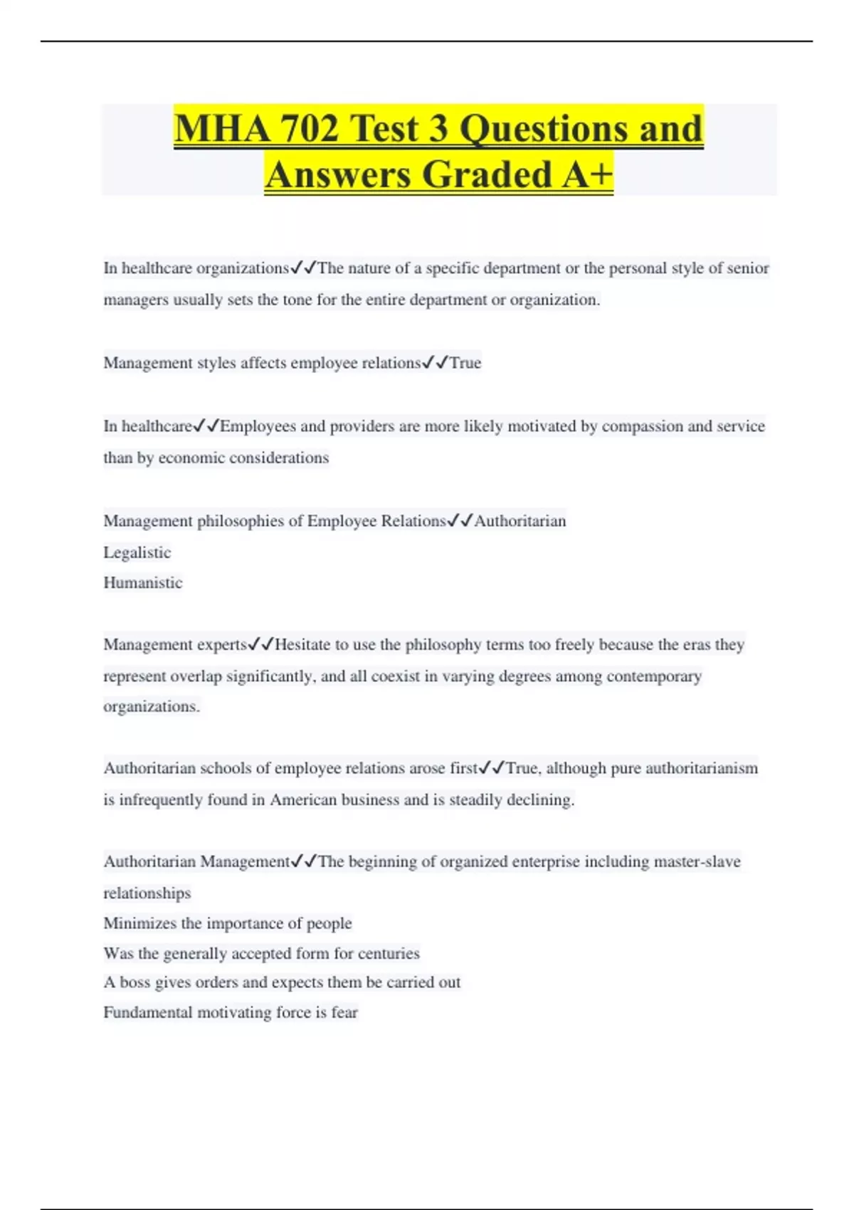 MHA 702 Test 3 Questions and Answers Graded A+ In healthcare organizationsThe nature of a specific department or the personal style of senior managers usually sets the tone for the entire department or organization. Management styles affects employee relationsTrue In healthcareEmployees and providers are more likely motivated by compassion and service than by economic considerations Management philosophies of Employee RelationsAuthoritarian Legalistic Humanistic Management expertsHesitate to use the philosophy terms too freely because the eras they represent overlap significantly, and all coexist in varying degrees among contemporary organizations. Authoritarian schools of employee relations arose firstTrue, although pure authoritarianism is infrequently found in American business and is steadily declining. Authoritarian ManagementThe beginning of organized enterprise including master-slave relationships Minimizes the importance of people Was the generally accepted form for centuries A boss gives orders and expects them be carried out Fundamental motivating force is fear