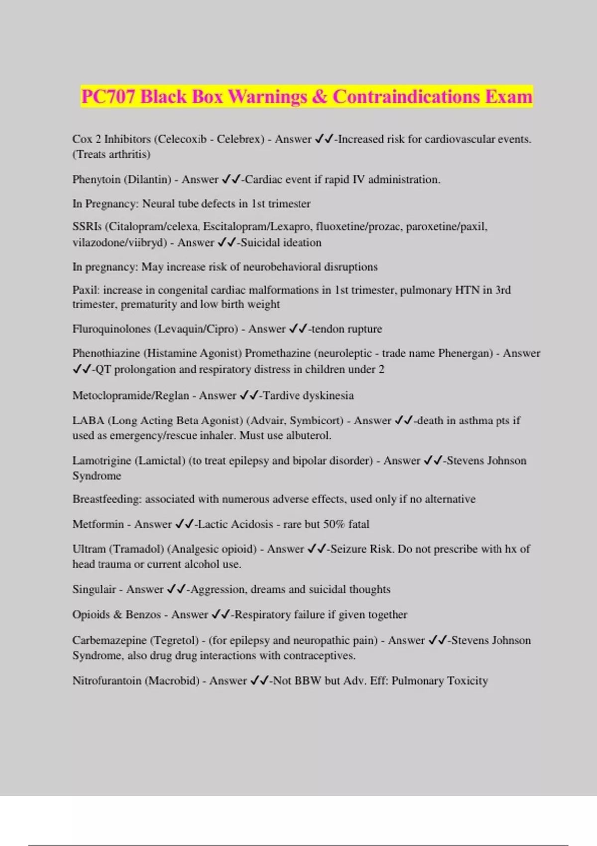 PC707 Black Box Warnings & Contraindications Exam Cox 2 Inhibitors (Celecoxib - Celebrex) - Answer ️️ -Increased risk for cardiovascular events. (Treats arthritis) Phenytoin (Dilantin) - Answer ️️ -Cardiac event if rapid IV administration. In Pregnancy: Neural tube defects in 1st trimester SSRIs (Citalopram/celexa, Escitalopram/Lexapro, fluoxetine/prozac, paroxetine/paxil, vilazodone/viibryd) - Answer ️️ -Suicidal ideation In pregnancy: May increase risk of neurobehavioral disruptions Paxil: increase in congenital cardiac malformations in 1st trimester, pulmonary HTN in 3rd trimester, prematurity and low birth weight Fluroquinolones (Levaquin/Cipro) - Answer ️️ -tendon rupture Phenothiazine (Histamine Agonist) Promethazine (neuroleptic - trade name Phenergan) - Answer ️️ -QT prolongation and respiratory distress in children under 2 Metoclopramide/Reglan - Answer ️️ -Tardive dyskinesia LABA (Long Acting Beta Agonist) (Advair, Symbicort) - Answer ️️ -death in asthma pts if used as emergency/rescue inhaler. Must use albuterol. Lamotrigine (Lamictal) (to treat epilepsy and bipolar disorder) - Answer ️️ -Stevens Johnson Syndrome Breastfeeding: associated with numerous adverse effects, used only if no alternative Metformin - Answer ️️ -Lactic Acidosis - rare but 50% fatal Ultram (Tramadol) (Analgesic opioid) - Answer ️️ -Seizure Risk. Do not prescribe with hx of head trauma or current alcohol use. Singulair - Answer ️️ -Aggression, dreams and suicidal thoughts Opioids & Benzos - Answer ️️ -Respiratory failure if given together Carbemazepine (Tegretol) - (for epilepsy and neuropathic pain) - Answer ️️ -Stevens Johnson Syndrome, also drug drug interactions with contraceptives. Nitrofurantoin (Macrobid) - Answer ️️ -Not BBW but Adv. Eff: Pulmonary Toxicity