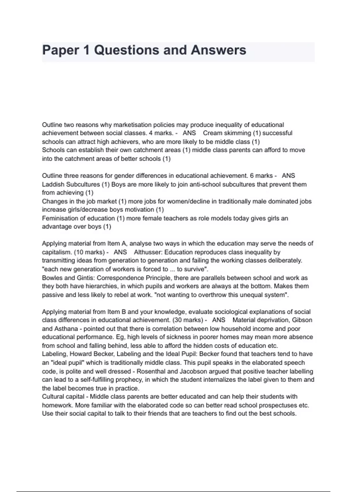 Biology Paper 1 Question And Answers Tested And Verified Outline two reasons why marketisation policies may produce inequality of educational achievement between social classes. 4 marks. - ANS Cream skimming (1) successful schools can attract high achievers, who are more likely to be middle class (1) Schools can establish their own catchment areas (1) middle class parents can afford to move into the catchment areas of better schools (1) Outline three reasons for gender differences in educational achievement. 6 marks - ANS Laddish Subcultures (1) Boys are more likely to join anti-school subcultures that prevent them from achieving (1) Changes in the job market (1) more jobs for women/decline in traditionally male dominated jobs increase girls/decrease boys motivation (1) Feminisation of education (1) more female teachers as role models today gives girls an advantage over boys (1) Applying material from Item A, analyse two ways in which the education may serve the needs of capitalism. (10 marks) - ANS Althusser: Education reproduces class inequality by transmitting ideas from generation to generation and failing the working classes deliberately. "each new generation of workers is forced to ... to survive". Bowles and Gintis: Correspondence Principle, there are parallels between school and work as they both have hierarchies, in which pupils and workers are always at the bottom. Makes them passive and less likely to rebel at work. "not wanting to overthrow this unequal system". Applying material from Item B and your knowledge, evaluate sociological explanations of social class differences in educational achievement. (30 marks) - ANS Material deprivation, Gibson and Asthana - pointed out that there is correlation between low household income and poor educational performance. Eg, high levels of sickness in poorer homes may mean more absence from school and falling behind, less able to afford the hidden costs of education etc. Labeling, Howard Becker, Labeling and the Ideal Pupil: Becker found that teachers tend to have an "ideal pupil" which is traditionally middle class. This pupil speaks in the elaborated speech code, is polite and well dressed - Rosenthal and Jacobson argued that positive teacher labelling can lead to a self-fulfilling prophecy, in which the student internalizes the label given to them and the label becomes true in practice.