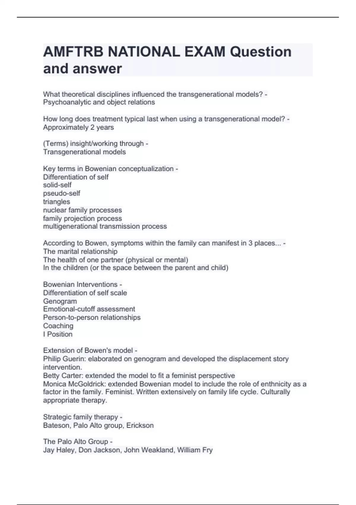 AMFTRB NATIONAL EXAM Question and answer