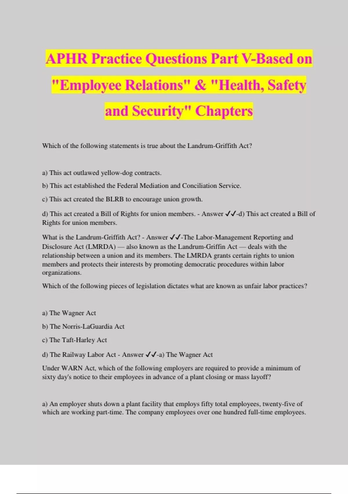 APHR Practice Questions Part V-Based on "Employee Relations" & "Health, Safety and Security" Chapters Which of the following statements is true about the Landrum-Griffith Act? a) This act outlawed yellow-dog contracts. b) This act established the Federal Mediation and Conciliation Service. c) This act created the BLRB to encourage union growth. d) This act created a Bill of Rights for union members. - Answer ️️ -d) This act created a Bill of Rights for union members. What is the Landrum-Griffith Act? - Answer ️️ -The Labor-Management Reporting and Disclosure Act (LMRDA) — also known as the Landrum-Griffin Act — deals with the relationship between a union and its members. The LMRDA grants certain rights to union members and protects their interests by promoting democratic procedures within labor organizations. Which of the following pieces of legislation dictates what are known as unfair labor practices? a) The Wagner Act b) The Norris-LaGuardia Act c) The Taft-Harley Act d) The Railway Labor Act - Answer ️️ -a) The Wagner Act Under WARN Act, which of the following employers are required to provide a minimum of sixty day's notice to their employees in advance of a plant closing or mass layoff? a) An employer shuts down a plant facility that employs fifty total employees, twenty-five of which are working part-time. The company employees over one hundred full-time employees. b) Thirty full-time employees are laid off by a company at a single site that employs 120 full- time individuals for a three-month period. c) A company lays off 250 full-time employees at a single site that employs 650 full-time individuals d) An employer shuts down a plant facility that has already been partially idled for quite some time. Only forty employees remain working at the site. The company employs over one hundred full time employees. - Answer ️️ -c) A company lays off 250 full-time employees at a single site that employs 650 full-time individuals What is the WARN Act? - Answer ️️ -The Worker Adjustment and Retraining Notification Act of 1988 is a US labor law which protects employees, their families, and communities by requiring most employers with 100 or more employees to provide 60 calendar-day advance notification of plant closings and mass layoffs of employees, as defined in the Act. Which of the following pieces of legislation established a commission to study how women and minorities face significant barriers and are prevented from reaching management positions? a) Title II b) The Civil Rights Act of 1991 c) Equal Pay Act d) The Glass Ceiling Act - Answer ️️ -d) The Glass