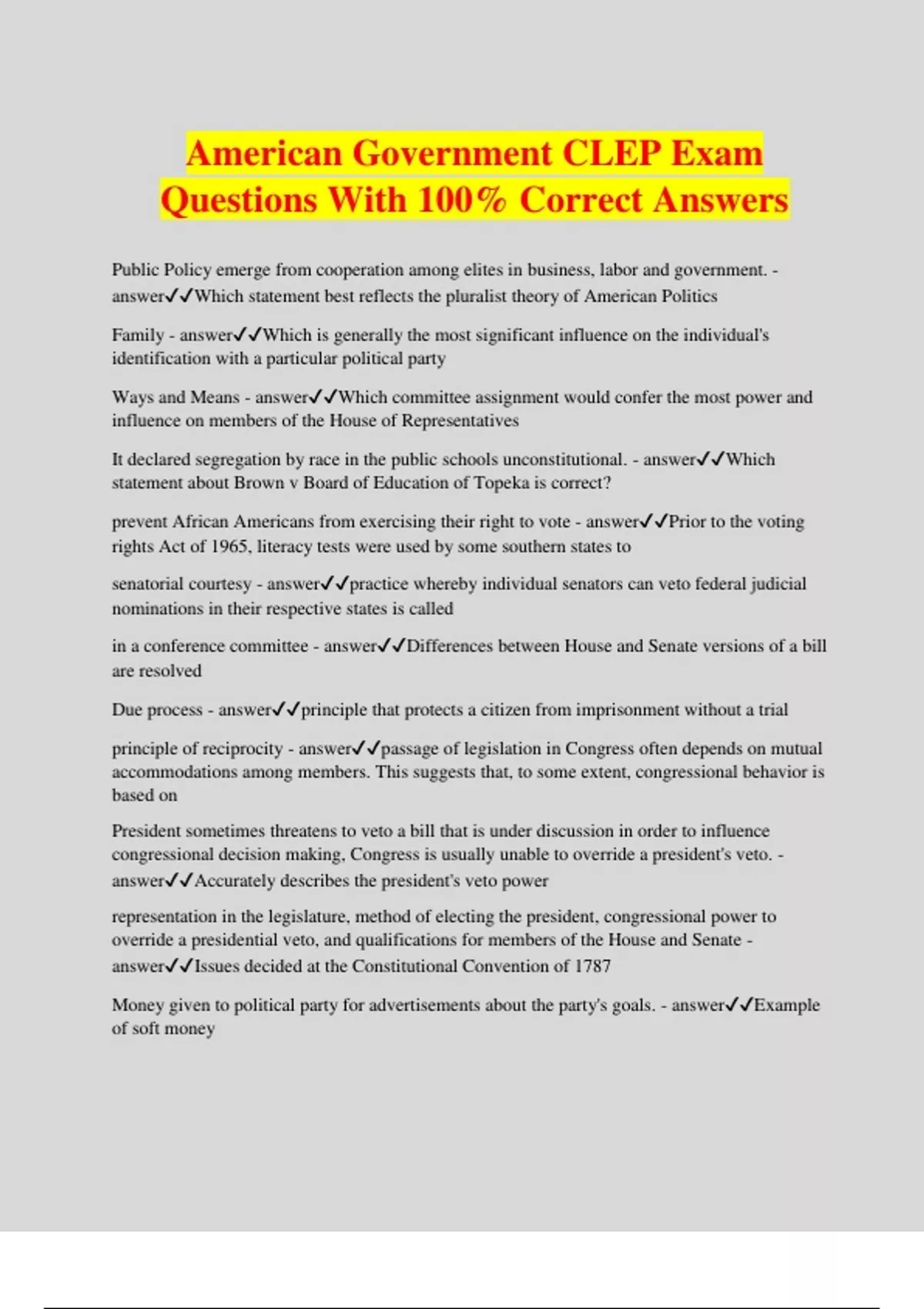 American Government CLEP Exam Questions With 100% Correct Answers Public Policy emerge from cooperation among elites in business, labor and government. - answerWhich statement best reflects the pluralist theory of American Politics Family - answerWhich is generally the most significant influence on the individual's identification with a particular political party Ways and Means - answerWhich committee assignment would confer the most power and influence on members of the House of Representatives It declared segregation by race in the public schools unconstitutional. - answerWhich statement about Brown v Board of Education of Topeka is correct? prevent African Americans from exercising their right to vote - answerPrior to the voting rights Act of 1965, literacy tests were used by some southern states to senatorial courtesy - answerpractice whereby individual senators can veto federal judicial nominations in their respective states is called in a conference committee - answerDifferences between House and Senate versions of a bill are resolved Due process - answerprinciple that protects a citizen from imprisonment without a trial principle of reciprocity - answerpassage of legislation in Congress often depends on mutual accommodations among members. This suggests that, to some extent, congressional behavior is based on President sometimes threatens to veto a bill that is under discussion in order to influence congressional decision making, Congress is usually unable to override a president's veto. - answerAccurately describes the president's veto power representation in the legislature, method of electing the president, congressional power to override a presidential veto, and qualifications for members of the House and Senate - answerIssues decided at the Constitutional Convention of 1787 Money given to political party for advertisements about the party's goals. - answerExample of soft money the loyalties of cabinet members are often divided between loyalty to the president and loyalty to their own executive departments - answerthe usefulness to the president of having cabinet members as political advisers is undermined by the fact remain silent during questioning, be represented by counsel, be informed of the charges pending, receive a trial by jury in a criminal case - answerConstitutional rights neither the federal government or states can restrict dramatized issues and positions that were being ignored by major parties - answerthird party candidates have been effective vehicles of pro