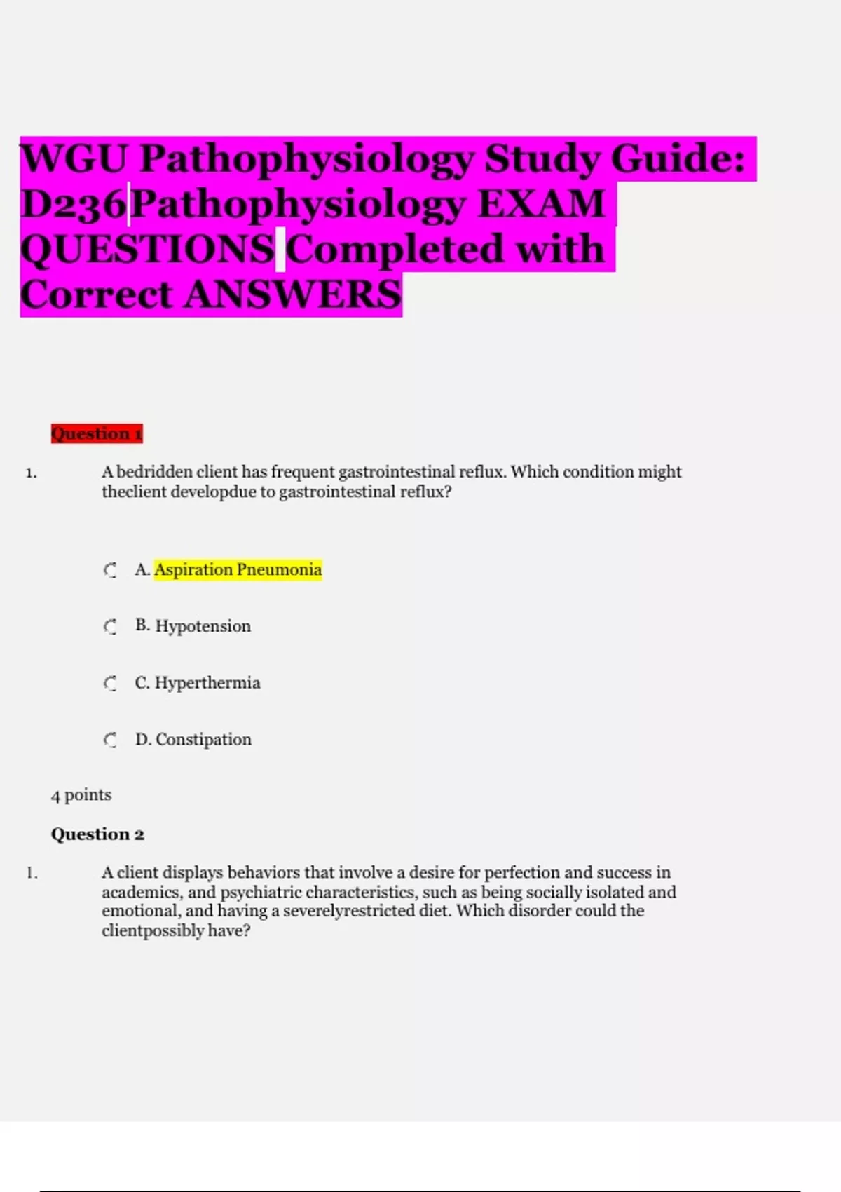 WGU Pathophysiology Study Guide: D236Pathophysiology EXAM QUESTIONS Completed with Correct ANSWERS Question 1 1. A bedridden client has frequent gastrointestinal reflux. Which condition might theclient developdue to gastrointestinal reflux? A. Aspiration Pneumonia B. Hypotension C. Hyperthermia D. Constipation 4 points Question 2 1. A client displays behaviors that involve a desire for perfection and success in academics, and psychiatric characteristics, such as being socially isolated and emotional, and having a severelyrestricted diet. Which disorder could the clientpossibly have? A. Anorexia nervosa B. Bulimia nervosa C. Binge eating D. Purging disorder 4 points Question 3 1. Aclient complains of headaches during morning hours and sleep, and alsorhinorrhea and tearingof the eye. Which type of headache is likely to be diagnosed for the client? A. Tension headache B. Migraine C. Cluster headache D. Cephalgia 4 points