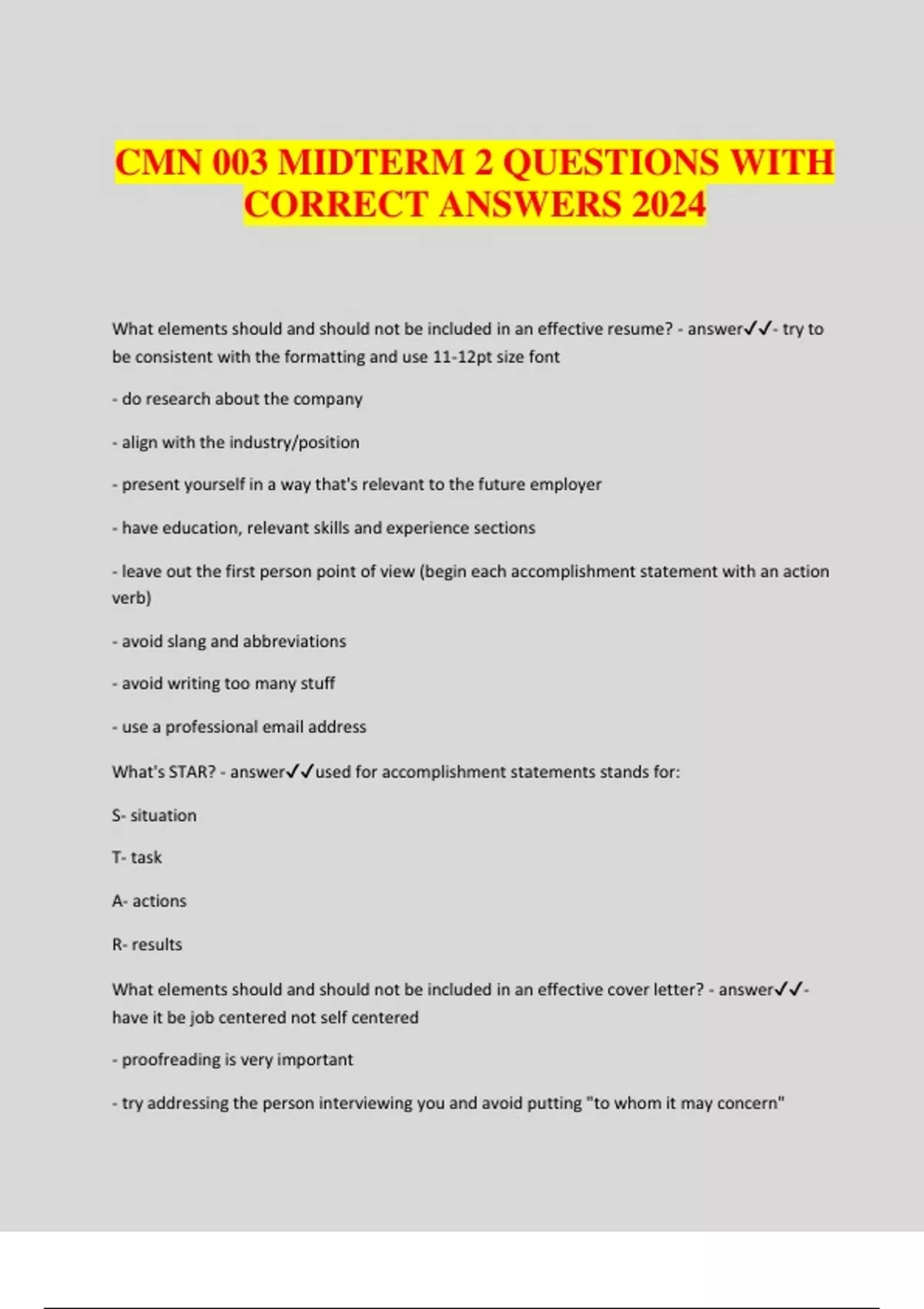 CMN 003 MIDTERM 2 QUESTIONS WITH CORRECT ANSWERS 2024 What elements should and should not be included in an effective resume? - answer- try to be consistent with the formatting and use 11-12pt size font - do research about the company - align with the industry/position - present yourself in a way that's relevant to the future employer - have education, relevant skills and experience sections - leave out the first person point of view (begin each accomplishment statement with an action verb) - avoid slang and abbreviations - avoid writing too many stuff - use a professional email address What's STAR? - answerused for accomplishment statements stands for: S- situation T- task A- actions R- results What elements should and should not be included in an effective cover letter? - answer- have it be job centered not self centered - proofreading is very important - try addressing the person interviewing you and avoid putting "to whom it may concern" what word choices maximize your experience descriptions? - answeraction verbs your instructor disagrees with ICC on specific resume elements. What are these? - answerNo objective and keep the length of resume to one page what steps should you take to clean up your online persona? - answer1. Make a list of all of your accounts 2. review your personal security settings 3. think like a hiring manager 4. cleanse your profile of inappropriate items 5. consider the professional image you want to project 6. type your name into several search engines and see what comes up 7. curate your online posting content what you do and not do in a networking introduction - answer- don't say hi my name is but shake hands, make eye contact and state your name - don't mention too much about yourself but ask about them their career and their professional goal, try to understand them - don't tell them you want a job but share your future goals How can someone grow their network? - answerthink like anyone you regularly interact with as networks since they can tap in with other contacts. focus on the bond that you are making, don't limit yourself to colleagues, think about family and friends too. Get to know the person really and not just their job describe/ define perception. - answerthe process of selecting, organizing and interpreting information how perception does it impact communication? - answeraffects how we communicate with others and how we interpret other's communication why is perception important to understand? - answerthis is crucial to our success because people tend to perceive things differently, the same message may be interpreted quite differently by different peop