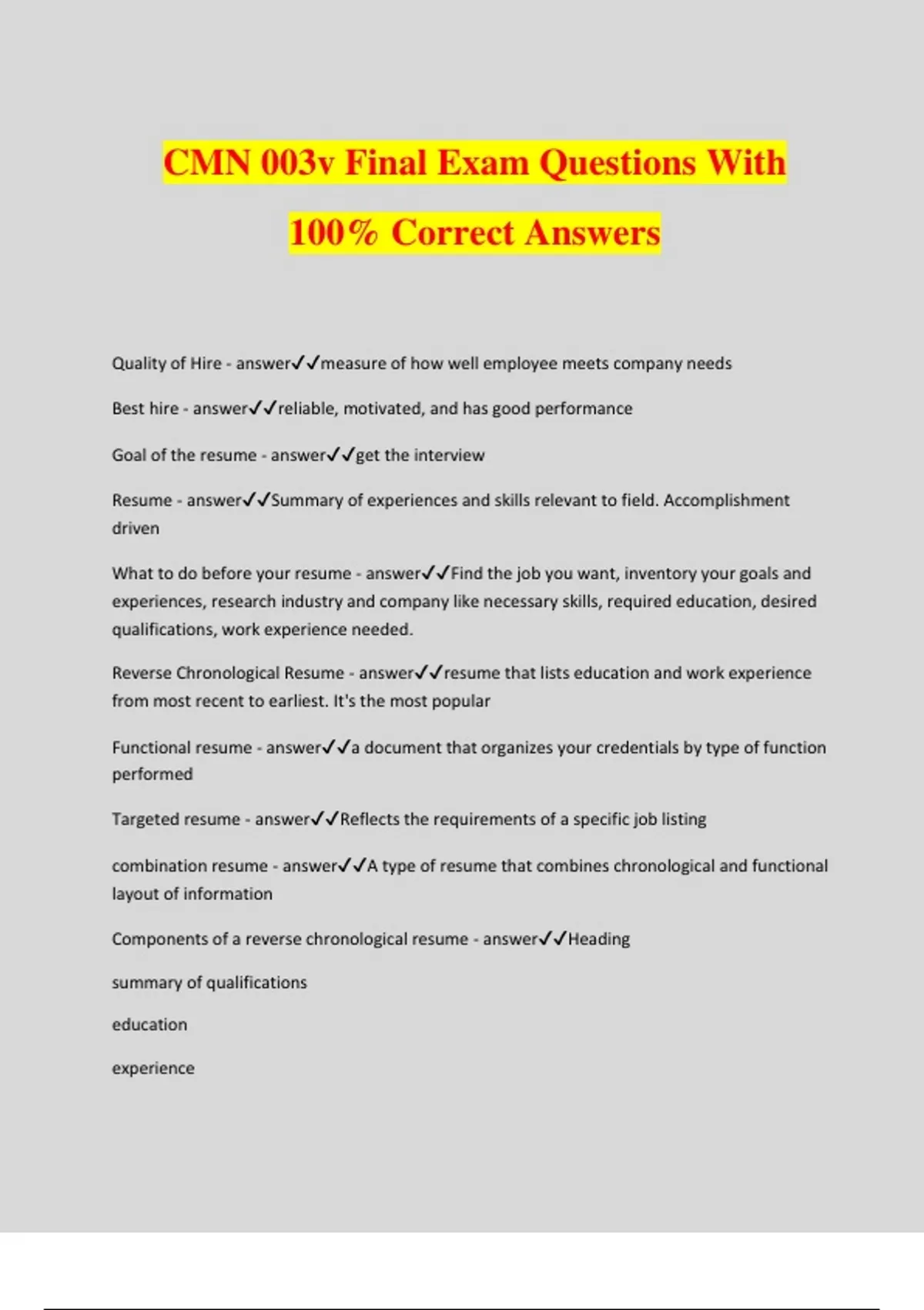 CMN 003v Final Exam Questions With 100% Correct Answers Quality of Hire - answermeasure of how well employee meets company needs Best hire - answerreliable, motivated, and has good performance Goal of the resume - answerget the interview Resume - answerSummary of experiences and skills relevant to field. Accomplishment driven What to do before your resume - answerFind the job you want, inventory your goals and experiences, research industry and company like necessary skills, required education, desired qualifications, work experience needed. Reverse Chronological Resume - answerresume that lists education and work experience from most recent to earliest. It's the most popular Functional resume - answera document that organizes your credentials by type of function performed Targeted resume - answerReflects the requirements of a specific job listing combination resume - answerA type of resume that combines chronological and functional layout of information Components of a reverse chronological resume - answerHeading summary of qualifications education experience dont put an objective Heading - answername, email, address, phone number Summary of qualifcations - answerlinks background to job, use 3-6 bullet points of special accomplishments, key traits accomplishment statement! Education - answerhighest level first, major emphasis minor, GPA if its good include relevant coursework if necessary Certifications Training Experience - answercompany name, location, title, dates, duties. Make it easy to read, start with action verb! no pronouns. Check past v. present tense Cover Letter - answerIntroduces, clarifies position, highlights strengths, asks employer to take action. Should be job centered. Address it to a specific person! 1st Paragraph: why you are writing, position, if you were referred, where you found the ad Middle paragraph: interpret resume, provide info that highlights further and how qualifications match job. Final paragraph: Thank hiring manager, provide info for follow up Keep signature professional! How long is resume reviewed for - answer45 seconds How the content should be structured in resume - answerSTAR Method Situation Tasks Actions Results Haniz Self Inventory - answerCareer goals, abilities, and attributes Networking - answerproactive approach to building relationships to achieve shared goals. Work is relational not transactional! Informational interview - answerinterview someone for career advice ie qualifications and daily activi