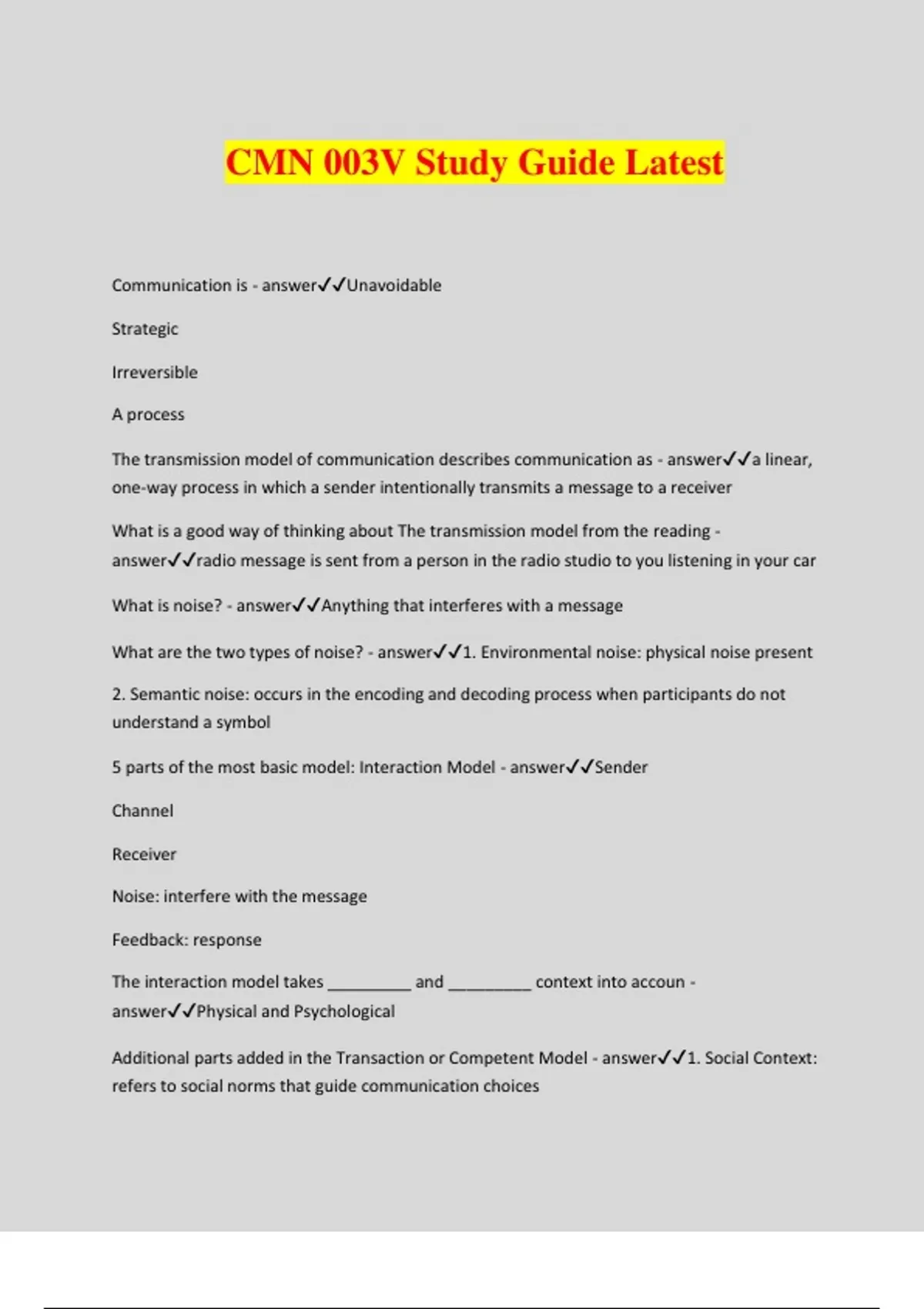 CMN 003V Study Guide Latest Communication is - answerUnavoidable Strategic Irreversible A process The transmission model of communication describes communication as - answera linear, one-way process in which a sender intentionally transmits a message to a receiver What is a good way of thinking about The transmission model from the reading - answerradio message is sent from a person in the radio studio to you listening in your car What is noise? - answerAnything that interferes with a message What are the two types of noise? - answer1. Environmental noise: physical noise present 2. Semantic noise: occurs in the encoding and decoding process when participants do not understand a symbol 5 parts of the most basic model: Interaction Model - answerSender Channel Receiver Noise: interfere with the message Feedback: response The interaction model takes _________ and _________ context into accoun - answerPhysical and Psychological Additional parts added in the Transaction or Competent Model - answer1. Social Context: refers to social norms that guide communication choices 2. Relational context: relationship with those you are communicating with 3. Cultural context: culture differences 4. Perceptual filters: lump of clay shaping with each transaction three types of rules that govern or control our use of words - answer1. Syntactic rules: order of words 2. Semantic rules: meaning of words 3. Contextual rules: word choice in context denotative meaning - answerthe common meaning, often found in the dictionary connotative meaning - answeroften not found in the dictionary but in the community of users itself Abstraction ladder: vague to specific - answer Equivocation - answeruses words that have unclear or misleading definitions and helps a speaker avoid uncomfortable situati