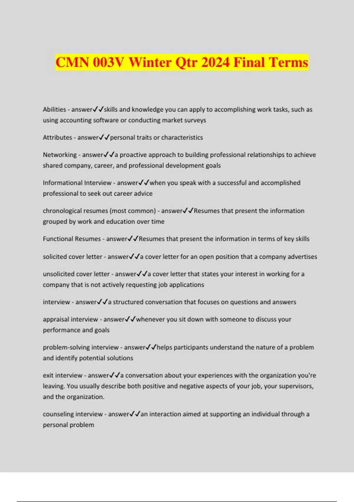 CMN 003V Winter Qtr 2024 Final Terms Abilities - answerskills and knowledge you can apply to accomplishing work tasks, such as using accounting software or conducting market surveys Attributes - answerpersonal traits or characteristics Networking - answera proactive approach to building professional relationships to achieve shared company, career, and professional development goals Informational Interview - answerwhen you speak with a successful and accomplished professional to seek out career advice chronological resumes (most common) - answerResumes that present the information grouped by work and education over time Functional Resumes - answerResumes that present the information in terms of key skills solicited cover letter - answera cover letter for an open position that a company advertises unsolicited cover letter - answera cover letter that states your interest in working for a company that is not actively requesting job applications interview - answera structured conversation that focuses on questions and answers appraisal interview - answerwhenever you sit down with someone to discuss your performance and goals problem-solving interview - answerhelps participants understand the nature of a problem and identify potential solutions exit interview - answera conversation about your experiences with the organization you're leaving. You usually describe both positive and negative aspects of your job, your supervisors, and the organization. counseling interview - answeran interaction aimed at supporting an individual through a personal problem service-oriented interview - answera conversation meant to help you with a product or service you have purchased persuasive interview - answera conversation intended to affect your belief, opinion, or behavior. survey interview - answeran interaction aimed at gathering information selection interview - answera conversation intended to help the interviewer choose the most appropriate person for a position, an assignment, a promotion, or an award open-ended quesitons - answerquestions that invite a broad range of answers. They give you the opportunity to reply in a way that reflects positively on you. close-ended questions - answerquestions that prompt brief, specific answers hypothetical questions - answerquestions that describe a realistic situation and ask you to speculate about how you would react. Your answer helps the interviewer see how you would manage the situation. probing questions - answerquestions that request more detail on answers you have already provided STAR method - answerSituation (in which you created a positive outcome), Tasks (you were assigned as part of a process), Actions (you took that), Results (that occurred). This is an approach for responding to interview questions. Cross-functional team - answera team that includes members from various functional backgrounds, such as finance, marketing, and operations Virtual teams - answerteams that are composed of employees who rarely see one another in person and are usually geographically dispersed Forming stage (months 1 and 2) - answerStage when team members focus on gaining acceptance and avoiding conflict. This stage is a honeymoon period in which team members get to know one another. Storming stage (months 2 and 3) - answerStage when team members open up with their competing ideas about how the team sho