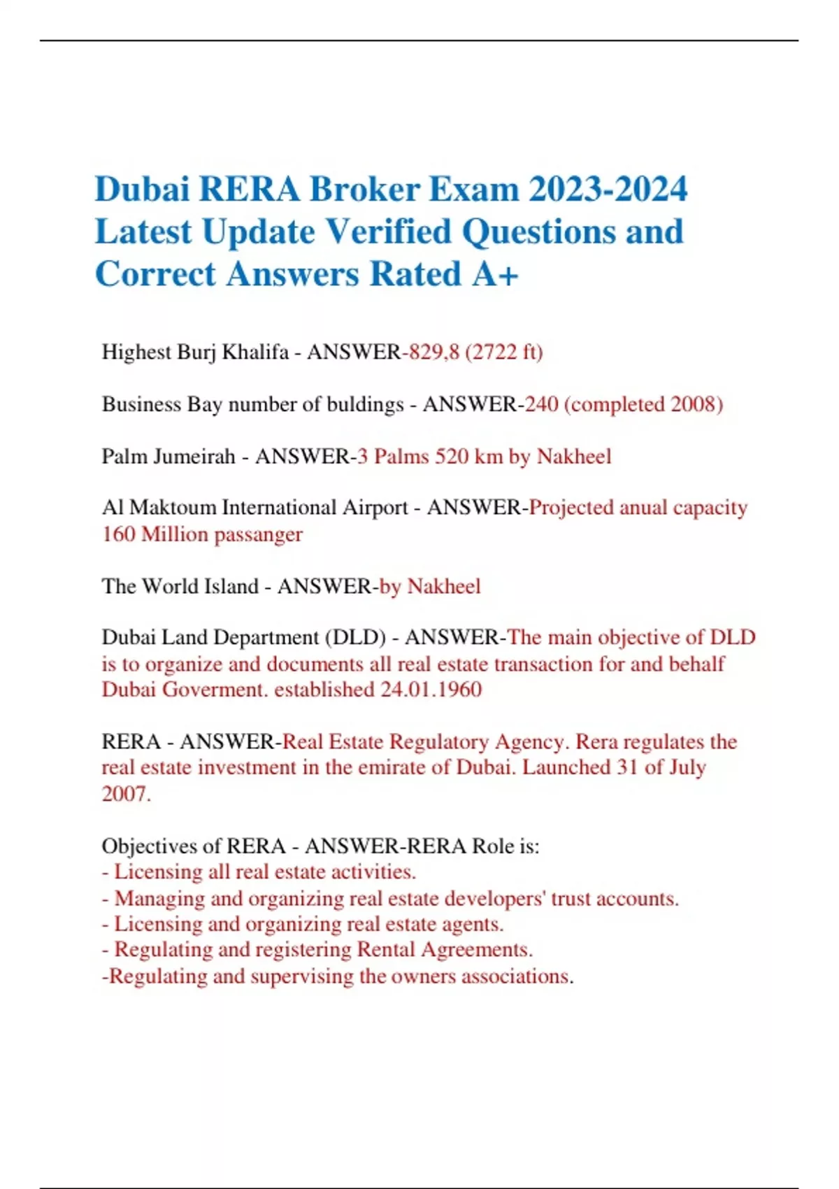Dubai RERA Broker Exam Latest Update Verified Questions and Correct Answers Rated A+