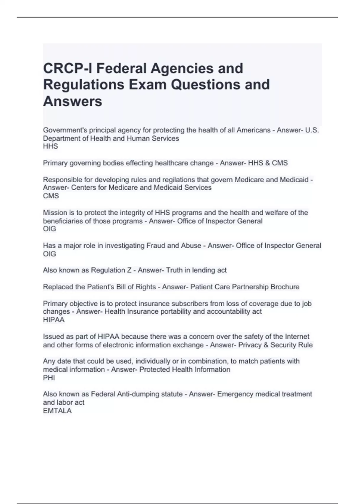 CRCP-I Federal Agencies and Regulations Exam Questions and Answers
