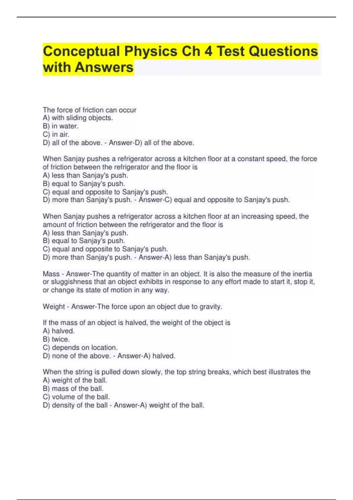 Conceptual Physics Ch 4 Test Questions with Answers The force of friction can occur A) with sliding objects. B) in water. C) in air. D) all of the above. - Answer-D) all of the above. When Sanjay pushes a refrigerator across a kitchen floor at a constant speed, the force of friction between the refrigerator and the floor is A) less than Sanjay's push. B) equal to Sanjay's push. C) equal and opposite to Sanjay's push. D) more than Sanjay's push. - Answer-C) equal and opposite to Sanjay's push. When Sanjay pushes a refrigerator across a kitchen floor at an increasing speed, the amount of friction between the refrigerator and the floor is A) less than Sanjay's push. B) equal to Sanjay's push. C) equal and opposite to Sanjay's push. D) more than Sanjay's push. - Answer-A) less than Sanjay's push. Mass - Answer-The quantity of matter in an object. It is also the measure of the inertia or sluggishness that an object exhibits in response to any effort made to start it, stop it, or change its state of motion in any way. Weight - Answer-The force upon an object due to gravity. If the mass of an object is halved, the weight of the object is A) halved. B) twice. C) depends on location. D) none of the above. - Answer-A) halved