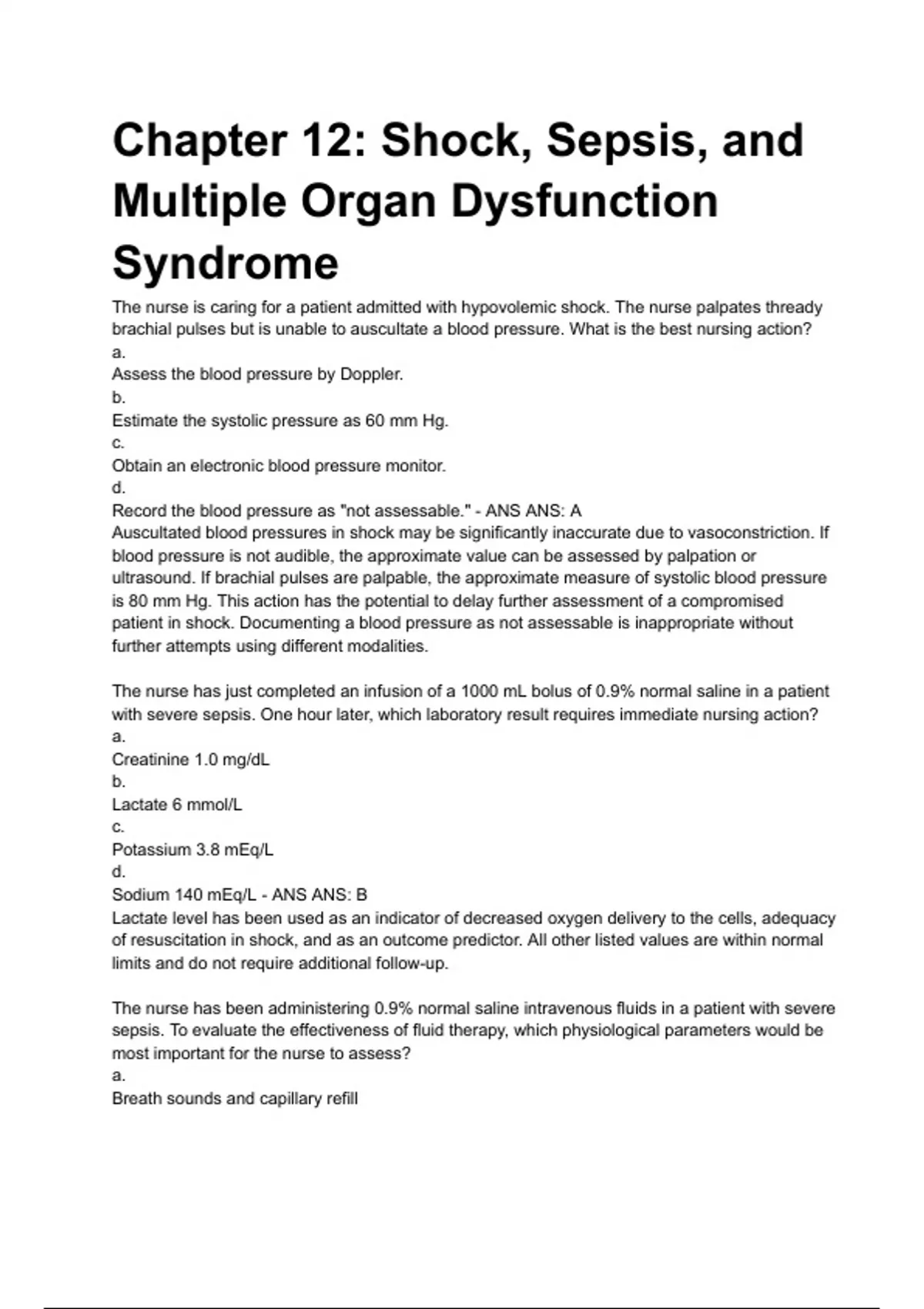 Chapter 12: Shock, Sepsis, and Multiple Organ Dysfunction Syndrome The nurse is caring for a patient admitted with hypovolemic shock. The nurse palpates thready brachial pulses but is unable to auscultate a blood pressure. What is the best nursing action? a. Assess the blood pressure by Doppler. b. Estimate the systolic pressure as 60 mm Hg. c. Obtain an electronic blood pressure monitor. d. Record the blood pressure as "not assessable." - ANS ANS: A Auscultated blood pressures in shock may be significantly inaccurate due to vasoconstriction. If blood pressure is not audible, the approximate value can be assessed by palpation or ultrasound. If brachial pulses are palpable, the approximate measure of systolic blood pressure is 80 mm Hg. This action has the potential to delay further assessment of a compromised patient in shock. Documenting a blood pressure as not assessable is inappropriate without further attempts using different modalities. The nurse has just completed an infusion of a 1000 mL bolus of 0.9% normal saline in a patient with severe sepsis. One hour later, which laboratory result requires immediate nursing action? a. Creatinine 1.0 mg/dL b. Lactate 6 mmol/L c. Potassium 3.8 mEq/L d. Sodium 140 mEq/L - ANS ANS: B Lactate level has been used as an indicator of decreased oxygen delivery to the cells, adequacy of resuscitation in shock, and as an outcome predictor. All other listed values are within normal limits and do not require additional follow-up. The nurse has been administering 0.9% normal saline intravenous fluids in a patient with severe sepsis. To evaluate the effectiveness of fluid therapy, which physiological parameters would be most important for the nurse to assess? a. Breath sounds and capillary refill b. Blood pressure and oral temperature c. Oral temperature and capillary refill d. Right atrial pressure and urine output - ANS ANS: D Early goal-directed therapy includes administration of IV fluids to keep central venous pressure at 8 mm Hg or greater. Combined with urine output, fluid therapy effectiveness can be adequately assessed. Evaluation of breath sounds assists with determining fluid overload in a patient but does not evaluate the effectiveness of fluid therapy. Capillary refill provides a quick assessment of the patient's overall cardiovascular status, but this assessment is not reliable in a patient who is hypothermic or has peripheral circulatory problems. Evaluation of oral temperature does not assess the effectiveness of fluid therapy in patients in shock. A patient is admitted to the critical care unit following coronary artery bypass surgery. Two hours postoperatively, the nurse assesses the following information: pulse is 120 beats/min; blood pressure is 70/50 mm Hg; pulmonary artery diastolic pressure is 2 mm Hg; cardiac output is 4 L/min; urine output is 250 mL/hr; chest drainage is 200 mL/hr. What is the best interpretation by the nurse? a. The assessed values are within normal limits. b. The patient is at risk for developing cardiogenic shock. c. The patient is at risk for developing fluid volume overload. d. The patient is at risk for developing hypovolemic shock. - ANS ANS: D Vital signs and hemodynamic values assessed collectively include classic signs and symptoms of hypovolemia. Both urine output and chest drainage values are high, contributing to the hypovolemia. Assessed values are not within normal limits. A cardiac output of 4 L/min is not indicative of cardiogenic shock. The patient is at risk for hypovolemia, not volume overload, as evidenced by excessive hourly chest drainage and urine output. A patient is admitted after collapsing at the end of a summer marathon. The patient is lethargic, with a heart rate of 110 beats/min, respiratory rate of 30 breaths/min, and a blood pressure of 78/46 mm Hg. The nurse anticipates administering which therapeutic intervention? a. Human albumin infusion b. Hypotonic saline solution c. Lactated Ringer's bolus d.